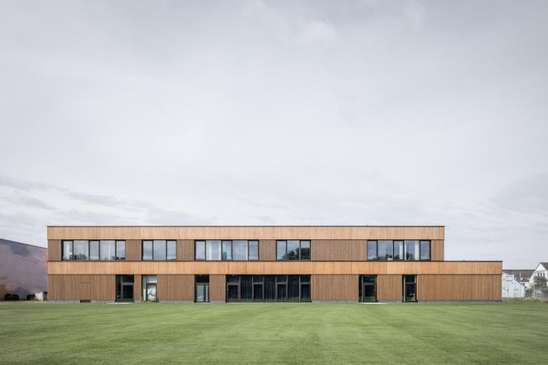 Im Bereich des durch die Stadt Fürth vorgeschlagenen Baufeldes nördlich der Horst-Weidemann Sporthalle und der Hans-Böckler Sporthalle befindet sich ein durch den Stadtjugendring genutzter, asphaltierter und umzäunter Basketballplatz sowie ein Beach-Volleyball-Platz. Unter Aufnahme benachbarter Gebäude- und Traufkanten wurde ein 2-geschossiger Baukörper entwickelt. Nach Norden schließt ein winkelförmiger, eingeschossiger Baukörper das Karree aus fünf Baukörpern und ordnet die heterogene Struktur. In der Mitte der Gebäude entsteht ein Platz, der als Vorplatz dem neuen Gebäude zugewiesen wird. Das Gebäude ist als Atriumtyp entwickelt. Der Eingang erfolgt über einen Windfang von Westen. Bibliothek, Pausenhalle und Musiksaal bilden ein zusammenhängendes Raumgefüge, das auch als Aula genutzt werden kann. Die Pausenhalle wird begrenzt durch den über beide Geschosse vorhandenen Block mit Aufzug, WC und Nebenräumen. Nördlich liegt der musische Bereich. Zeichensaal und Werkraum öffnen sich zu einem Terrassenbereich. Der Mehrzweckraum und der Raum für Bewegungstherapie können über eine mobile Trennwand zu einem Raum zusammengeschaltet werden. Südlich der Pausenhalle befindet sich die Raumspange der Verwaltung mit Lehrerzimmern und Büros. Die Klassen- und Gruppenräume im 1. Obergeschoss gruppieren sich einhüftig um den Luftraum des 2-geschossigen Atriums. Die zentrale vertikale Erschließung erfolgt über eine großzügige, gewendelte Treppe. Im Bereich der Dachterrasse entsteht ein „grünes Klassenzimmer“.