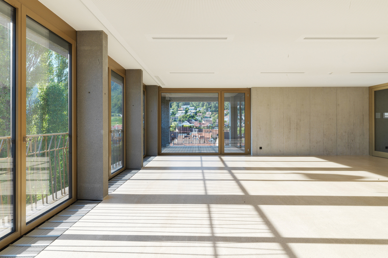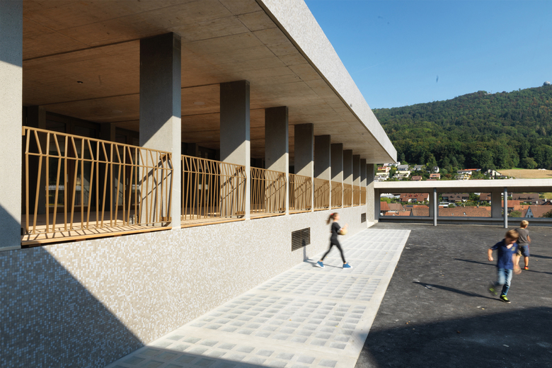 Das auf die neue Turnhalle aufgesetzte Schulgeschoss mit vier nutzungsneutralen Mehrzweckräumen (Tageshort, Spielgruppe, Klassenzimmer, Vereine, kleine Veranstaltungen) ist als lichtdurchflutetes Attikageschoss ausgebildet, das sich sowohl nach Westen, aber auch nach Osten auf den Pausenplatz hinaus orientiert. Diese Räume sind einzeln und auch von aussen nutzbar. Die grosszügige, gedeckte Terrasse schafft ein zusätzliches Nutzungspotential (auf den Pausenplatz orientierte Bühne). Die Nutzungsqualität des Schulhofes wird durch diese überdachten Aussenbereiche, welche gleichzeitig als Ballfang dienen, deutlich gesteigert.