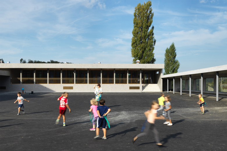 Der Pausenplatz, die Agora über dem Dorf, wird räumlich gefasst, indem der bestehende Maschenzaun durch ein raumhaltiges Vordach ersetzt wird, welches sich zum Dorf mit grossen „Fenstern“ äussert. Der Hallenneubau äussert sich auf diese Agora mit einer grosszügigen, gedeckten, vom Pausenplatz leicht erhöhten Terrasse vor den neuen Mehrzweck- und Schulräumen. Diese Konstellation belebt den Pausenplatz und macht diesen zum neuen Zentrum der Schulanlage Maiacher. Die neuen Schulräume können direkt über diese Terrasse oder über den Schuleingang erschlossen werden.