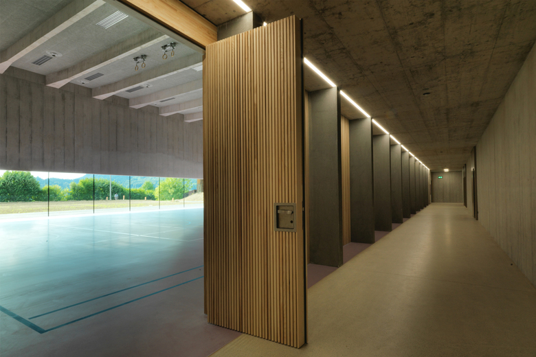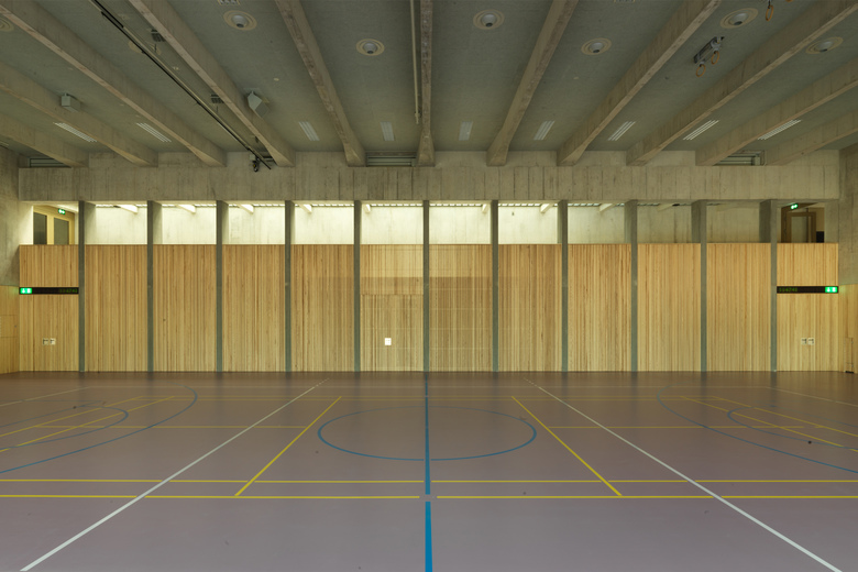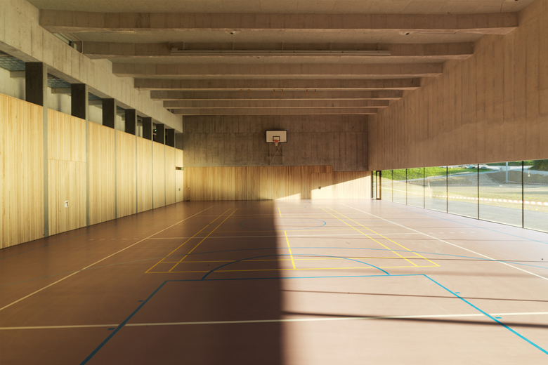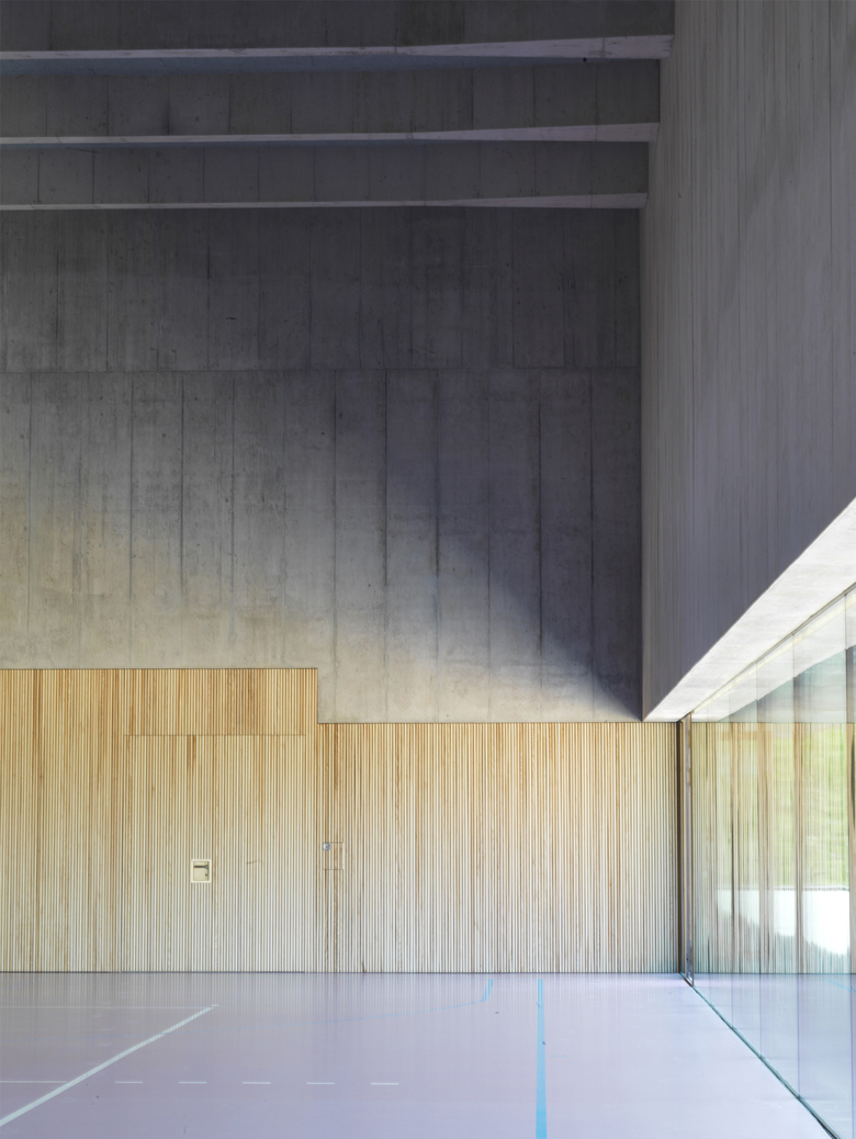 Die neue Mehrzweckhalle wird leicht aus der Fassadenebene der bestehenden Schule gerückt, der kleine Versatz wird über die Länge des neuen Sportplatzes als eingeschossiger Unterstand weitergezogen, damit der Kubus der grossen Halle mit der Topogafie der Umgebung verschmolzen und als weitere Anlieferung direkt an die Halle genutzt werden kann. Der Unterstand greift in die Landschaft hinein und begleitet den neuen Sportplatz auf seiner ganzen Länge als Unterstand für Zuschauer und für die notwendigen Aussengeräte. Die neue Mehrzwecksporthalle verbindet sich optisch mit der davorliegenden Spielwiese.