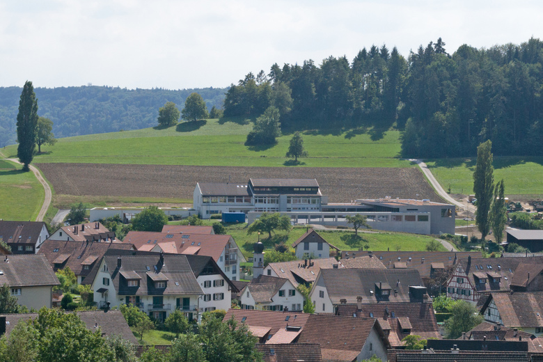 Unsere Analyse des Ortes zeigt, dass es nicht genügt, gegen Norden, zum Dorf hin, einfach „nichts“ zu machen, vielmehr soll die Schule auf dieser Seite ebenfalls ein Gesicht erhalten. Mit dem geplanten Neubau entsteht die Chance, diese Situation so zu klären, dass ein kräftiges Ensemble entsteht, dass sowohl ein prägnantes und gleichzeitig respektvolles Gesicht zum Dorf erhält, dessen Ganzes aber auch Mehr ist, als die Summe seiner Einzelteile. Die Gebäude fangen an, sich aufeinander zu beziehen. Die Transparenz Dorf - Schulanlage kann beibehalten werden.