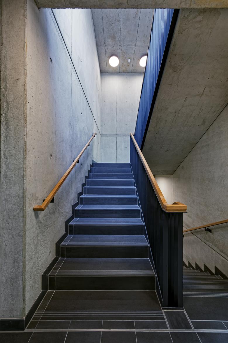 Die Kubatur setzt sich aus drei klaren, geometrischen Baukörpern zusammen. Die Holzfassade mit horizontal durchlaufenden Metallbändern bewirkt eine optische und funktionale Verbindung der einzelnen Bereiche.