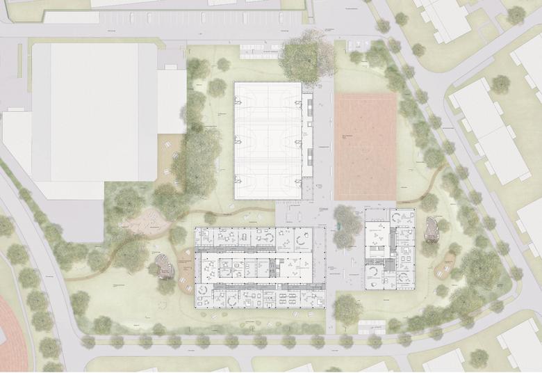 Die neue Schulanlage übernimmt die Ausrichtung der Stadthalle und spannt sich entlang einer zentralen Erschliessungsachse zwischen Kleinholzweg und Ahornallee auf. Die Aufteilung des Raumprogramms in drei Einzelkörper erlaubt es, den Massstab der Gesamtanlage im Übergang zur benachbarten Wohnnutzung harmonisch zu gestalten und eine adäquate Durchwegung des Quartiers zu gewährleisten. Die Gruppierung der vier Teilnutzungen Schulhaus, Turnhalle, Erweiterungsbau und Allwetterplatz um ein gemeinsames Zentrum, hat das Potenzial zu einem zentralen Ort für das gesamte Quartier zu werden.