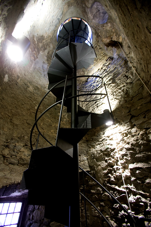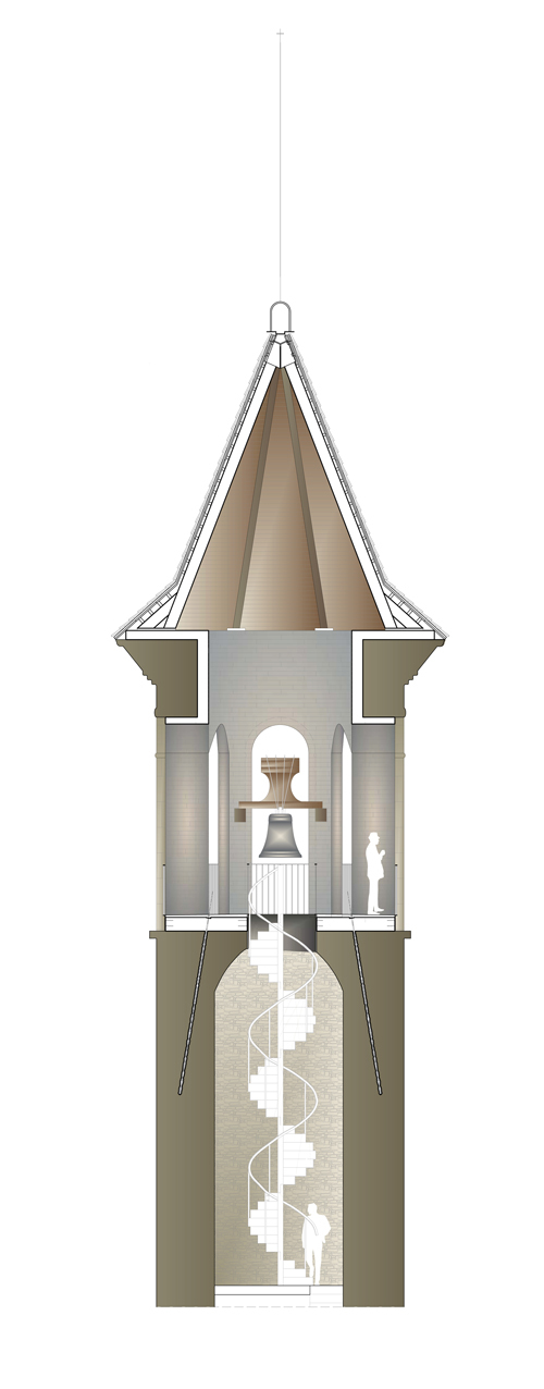The access: the staircase. An existing hole in the vault that supports the arches level allows to replace the original spiral staircase, this took up the interior of one belfry façade, for a light spiral staircase placed in the middle of the space. This action allows to retrieve a monumentally space undervalued and the opening of all the walled arches and give to the visitors a 365º visual of the city.