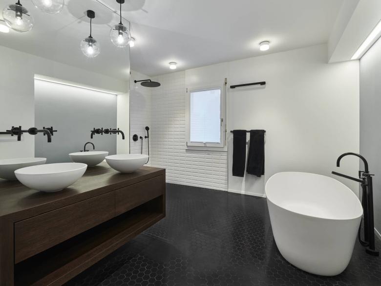 Das Dachgeschoss wird nun neben dem als Schlafzimmer mit Ankleide genutzten Teil durch ein neues Badezimmer ergänzt. Um der Familie die nötige Privatsphäre zu ermöglichen, schuf Stefan Müller eine stilvolle Glastrennwand in einem zeitgemässen Industrial-Look. Die Glastrennwand mit dem handgefertigten Geländer in demselben Schwarz-Matt-Stich schafft optische Klarheit und dient zugleich als Eyecatcher im Haus.