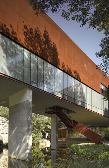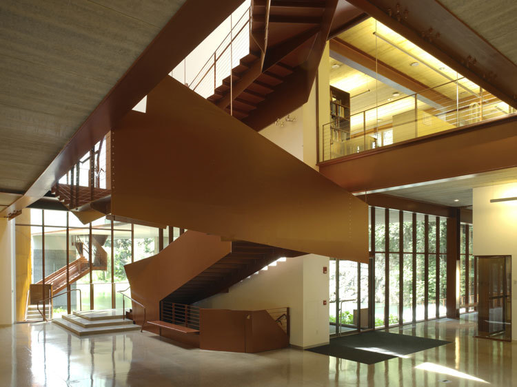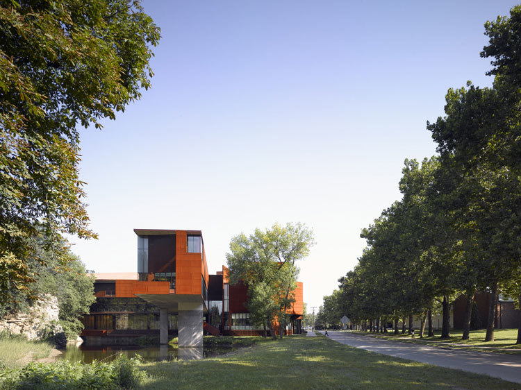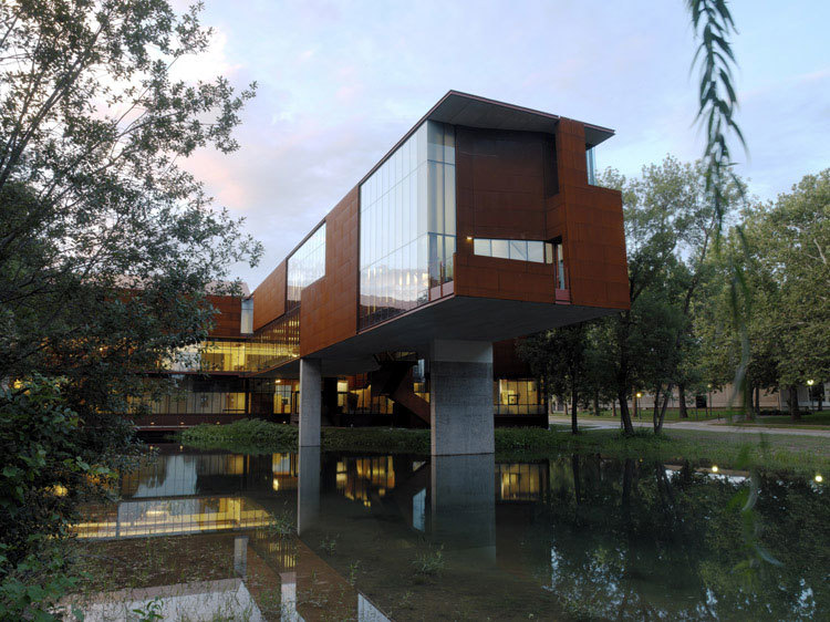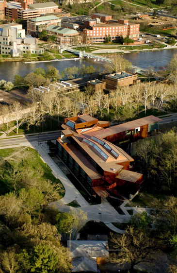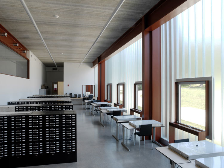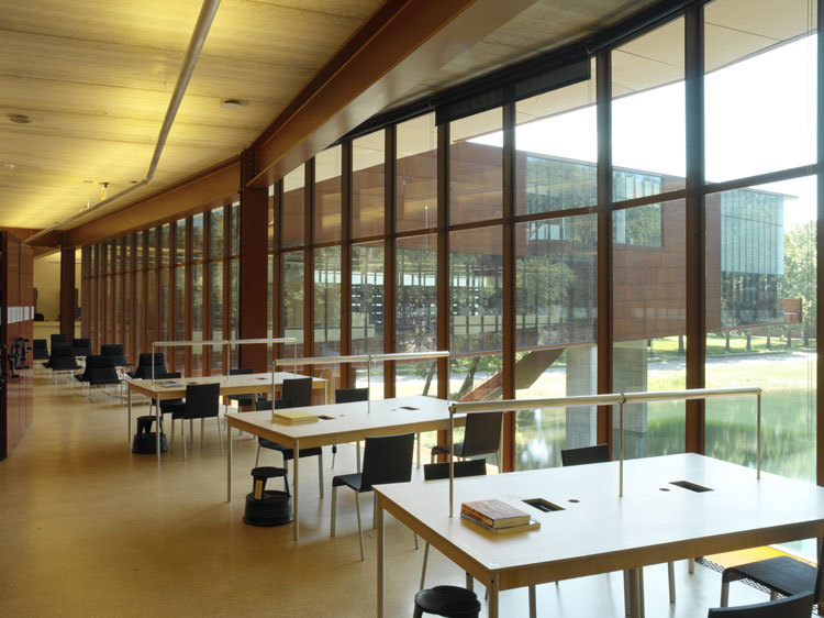 The new School of Art and Art History is a hybrid instrument of open edges and open center; instead of an object, the building is a “formless” instrument. Implied rather than actual volumes are outlined in the disposition of spaces. Flat or curved planes are slotted together or assembled with hinged sections. Flexible spaces open out from studios in warm weather. The main horizontal passages are meeting places with interior glass walls that reveal work-in-progress. The interplay of light is controlled through shading created by the overlapping planar exterior. Exposed tension rods of the partial bridge section contribute to the linear and planar architecture. Interior floors are framed in exposed steel and concrete planks, with integrated air and services distribution in the core voids. The resulting architecture is a hybrid vision of the future, combining bridge and loft spaces, theory with practice and human requirements with scientific principles.