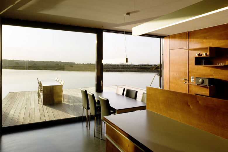 Uferseitig lässt sich der neun Meter lange Bau dank raumhoher gläserner Schiebetüren komplett öffnen wodurch ein fließender Übergang zwischen Schlaf-, Koch- und Wohnbereich und sowie Sonnendeck entsteht. So ergibt sich ein insgesamt fast 100 Quadratmeter großer “Wohnraum”.