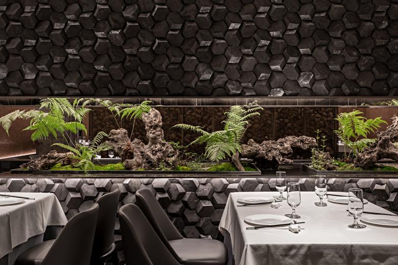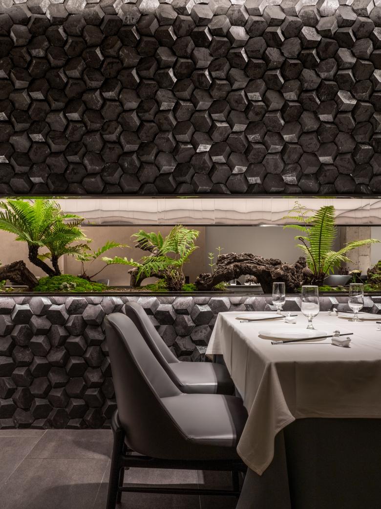 The plant landscape "framed" by the stone coincides with the axis of the Chinese landscape painting, like a dynamic painting welcoming guests to the space, which not only becomes a transparent natural partition but also serves as the corridor connecting the central area and surrounding seating area, thus, the space has a sense of wholeness and clear regional planning.
