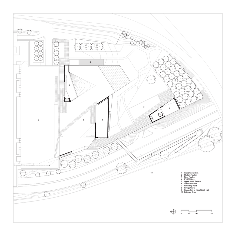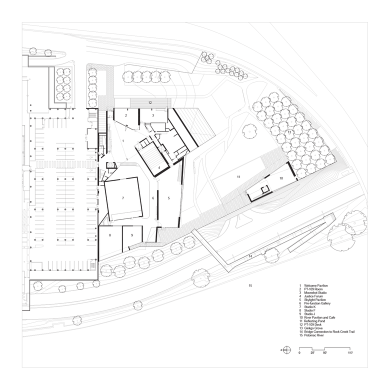 The design for The REACH merges architecture with the landscape to expand the dimensions of a living memorial. The landscape design includes a narrative reflection on the life of President Kennedy: a grove of 35 gingko trees, which will drop their golden autumn leaves in late November, acknowledges John F. Kennedy’s position as the 35th President of the United States; and a reflecting pool and mahogany landscape deck are built in the same dimensions and mahogany boards of Kennedy’s WWII boat, the PT109.