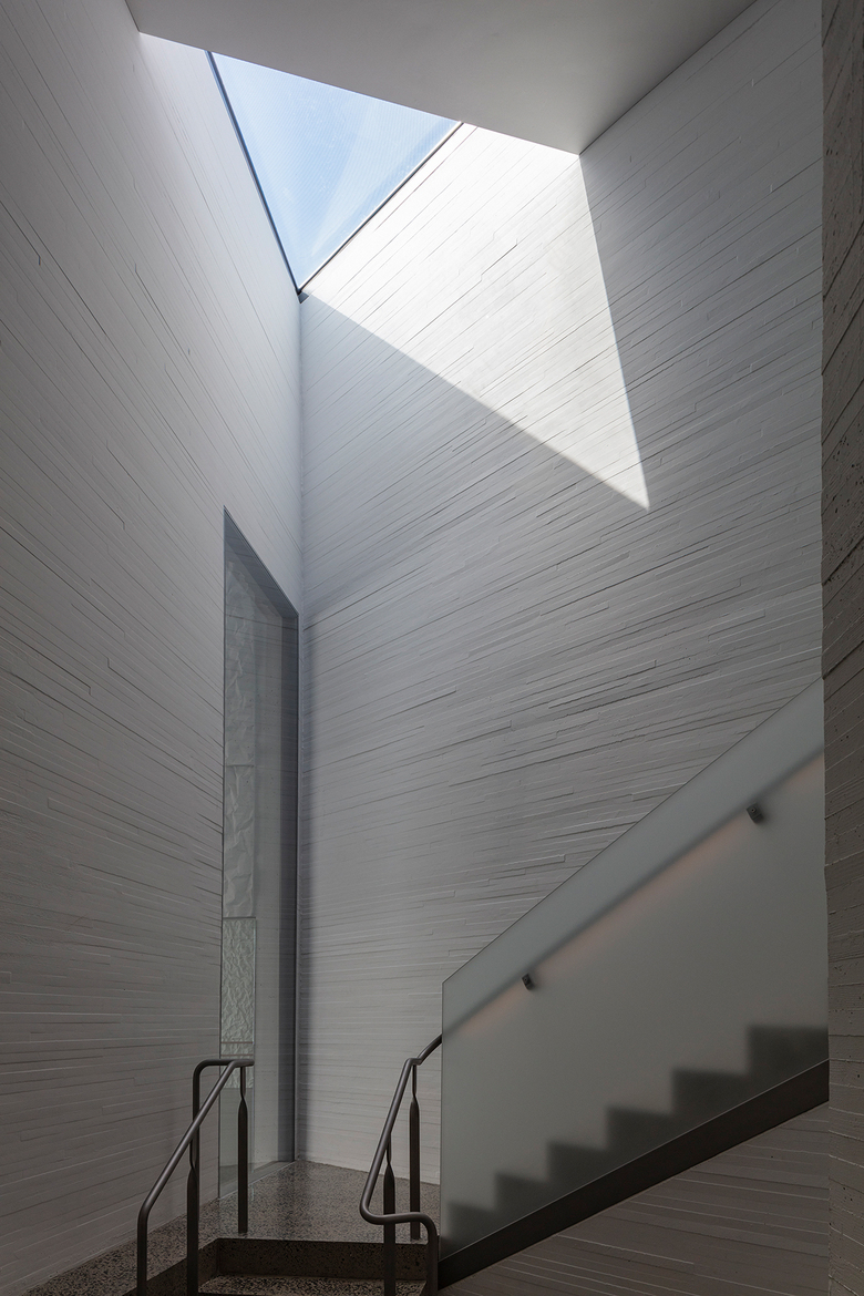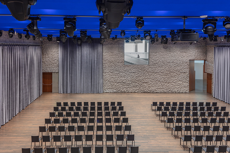 Inside the building, a newly developed crinkled concrete texture lines the walls of rehearsal and performance spaces, integrating acoustical qualities directly within the structural cast-in-place concrete walls.