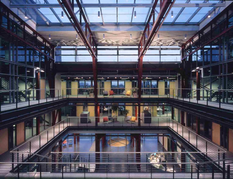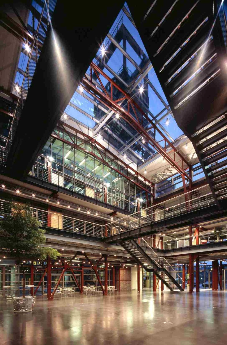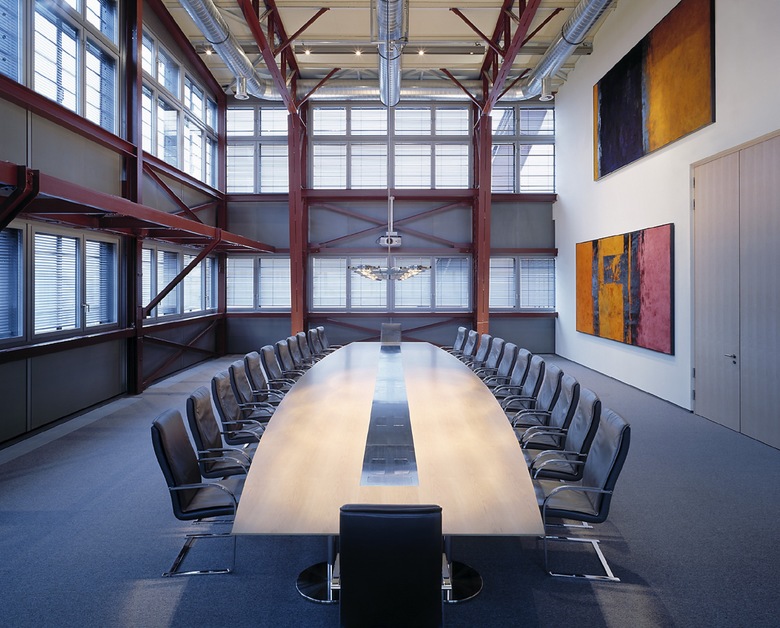 Das ‘Herzstück’ des Komplexes ist die ‘Lesehalle‘, das frühere Materiallager, welche nach einer weitgehenden Entkernung zur zentralen (Erschließungs-)Halle umgebaut wird. In ihr werden Treppen, transparente Aufzüge und Sanitärkerne anspruchsvoll organisiert und schaffen somit einen Ort für Ausstellungen und kulturelle Veranstaltungen. Unterschiedliche Büroraumstrukturen -ausgehend vom Kombi- und Gruppenbüro- erstrecken sich über 2 Obergeschosse. Die Ausweisung des Standardbüroraumes mit Zuordnung zu den Kombiflächen ist der Regelfall. Hierbei sollen die Erfordernisse einer hohen Zahl an Einzelbüros und einer großen Nachfrage an individuellen Arbeitsplätzen auf kleinstmöglicher Fläche erfüllt werden. Die horizontale Organisation der Büroräume bezieht sich jeweils auf die Ausdehnung der Abteilungen in einem Geschoss mit einer Orientierung zu den ‘grünen Innenhöfen’. Zusätzlich vermeidet eine vertikale Lichtdurchdringung in den Fluren und Hallen Dunkelzonen im Bereich der jeweiligen Erschließungsflächen. Das 3. Obergeschoss ist der Geschäftsleitung sowie dem zentralen Sitzungsbereich des Aufsichtsrates und der Gremien zugeordnet.