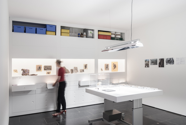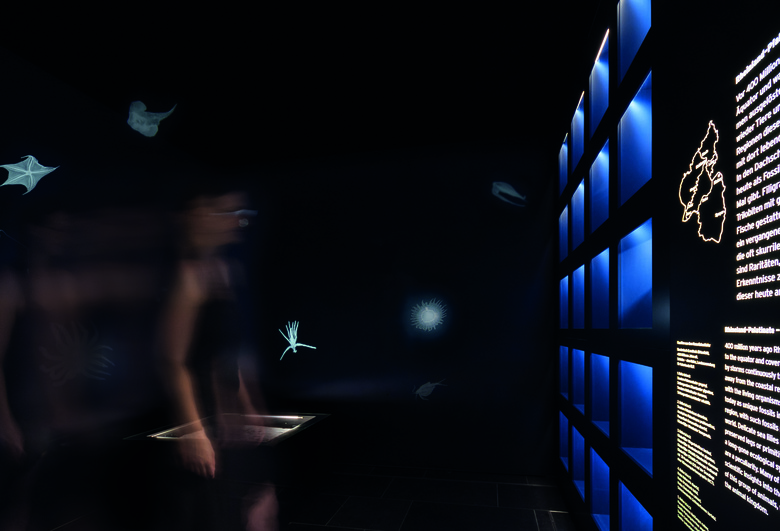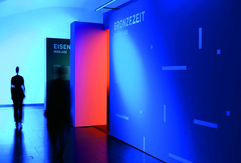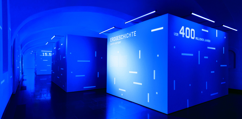 So wird die Entwicklungsgeschichte der rheinland-pfäl- zischen Region anhand von 13 sehr unterschiedlichen Kuben plastisch erzählt. Die Besucher tauchen auf ihrem Rundgang erst ins Urmeer ein, gelangen dann über ein Labor, in dem die Funde der Erdgeschichte analysiert werden, in den Kubus der Bronzezeit. Zu dieser Zeit entdeckten die Menschen die Metallbearbeitung durch Feuer. Dieses Element wird mit einer orangefarbenen, glühenden Decke umgesetzt, die den abstrakten Raum in ein warmes, rötliches Licht taucht.