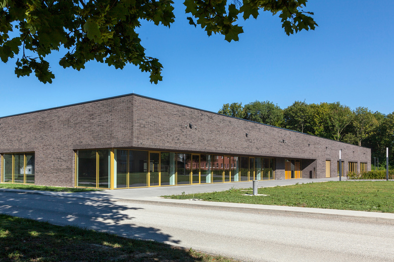 Die Technikzentrale mit der Lüftungstechnik wurde im Obergeschoss angeordnet, so dass in Verbindung mit dem überhohen Speisesaal ein insgesamt zweigeschossiger Baukörper entsteht. In diesen sind zwei eingeschossige Baukörper eingeschoben.