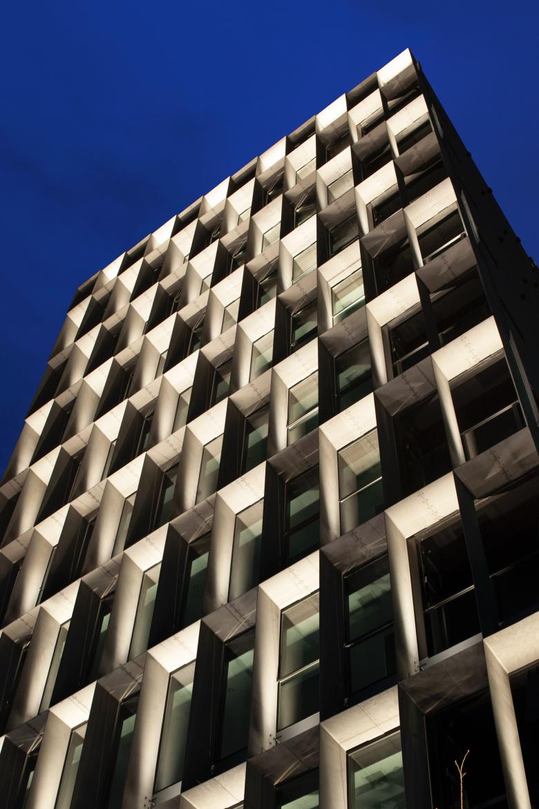 The façade presents a dual character between day and night. During daylight, the razor-thin edges of the steel plates cast sharp, elegant shadows, giving the building a refined presence. At night, LED uplights embedded at the base of each cell illuminate the louvers in a checkerboard pattern. As the thin plate edges deflect direct light, the steel’s material presence recedes, leaving only a floating matrix of light—a visual phenomenon that contrasts the hardness of steel with the weightlessness of illumination. This shift in perception between day and night transforms the urban experience, inverting how the building is read across time and light.