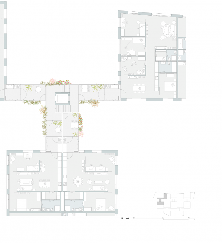 Über die gemeinsamen Treppen, welche jeweils vier Wohnungen pro Geschoss erschliessen, betreten wir durch ein ‚Gartentörchen› die eigene Laube, wo vielleicht schon der Apéro auf uns wartet. Im unbeheizten Wintergarten, der sich im Sommer vollkommen öffnen lässt und im Winter ein angenehmes Zwischenklima bildet, ziehen wir Mantel und Schuhe ab um dann weiter in den Ess- oder Wohnraum zu treten. Es entsteht so ein sukzessiver Übergang vom gemeinschaftlichen zum privaten Raum. Die Wohnungen zeichnen sich durch räumliche Vernetzung mit vielfältigen Raumbezügen aus. Trotz mässiger Grundrissgrössen sind die Wohnungen dadurch weitläufig und grosszügig. Sämtliche Wohnungen haben verschieden Ausblicke zu verschiedenen Seiten, die kleinsten sind zweiseitig übereck orientiert, die grösseren dreiseitig und einige sogar rundum. Zusammen mit den grossen Fenstern entsteht eine wohnliche und helle Wohnatmosphäre.