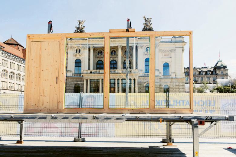 Structurally active red tension belts create associations with stacks of wood or freight. The image of a tied bundle is a key part of the concept: it symbolises Switzerland, made up of different regions, national languages and cantons. The dimensions of the prefabricated timber components correspond to the standard transport system. The entire assembly can be shipped in fourteen trucks. The individual elements are mounted on foundations, assembled, joined and bolted together during a total on-site construction time lasting less than two weeks. The result is a well-travelled and mobile house for Switzerland.