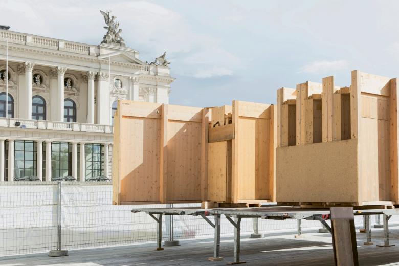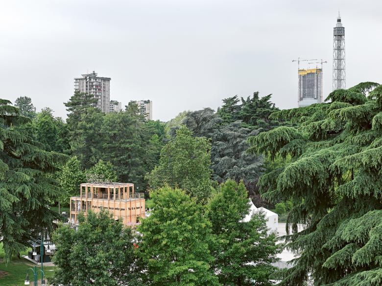 The House of Switzerland is a mobile building that serves a diplomatic function representing Switzerland’s professional sporting interests in various locations. Its wooden construction makes a connection between traditional and highly modern timber engineering. The largely standardised construction consisting of 193 elements has a tectonic expression. Four archaic, radially arranged structures connected to each other by metal locks enclose an inner courtyard.