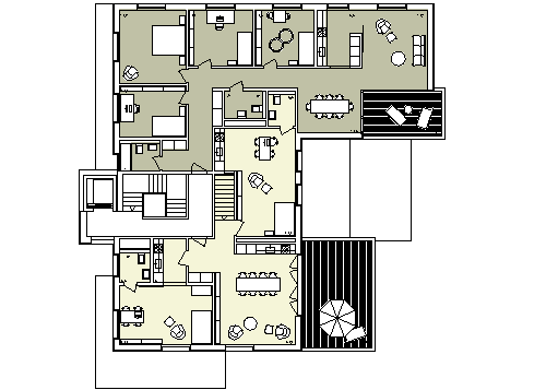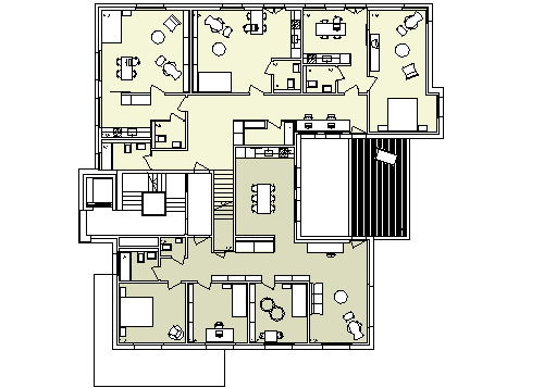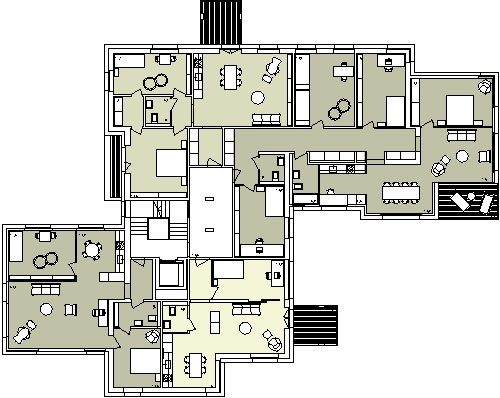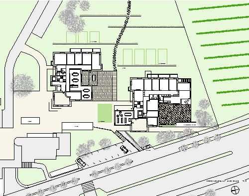 Die geforderte, bedeutende Erweiterung der Nutzfläche wird mittels verschiedener Anbauten realisiert. Deren volumetrische Gestaltung nimmt Prinzipien der ursprünglichen Komposition auf und gliedert die erweiterten Bauten nahtlos in die Gesamtanlage Heizenholz (Jugendheim und genossenschaftliches Wohnen) ein.
