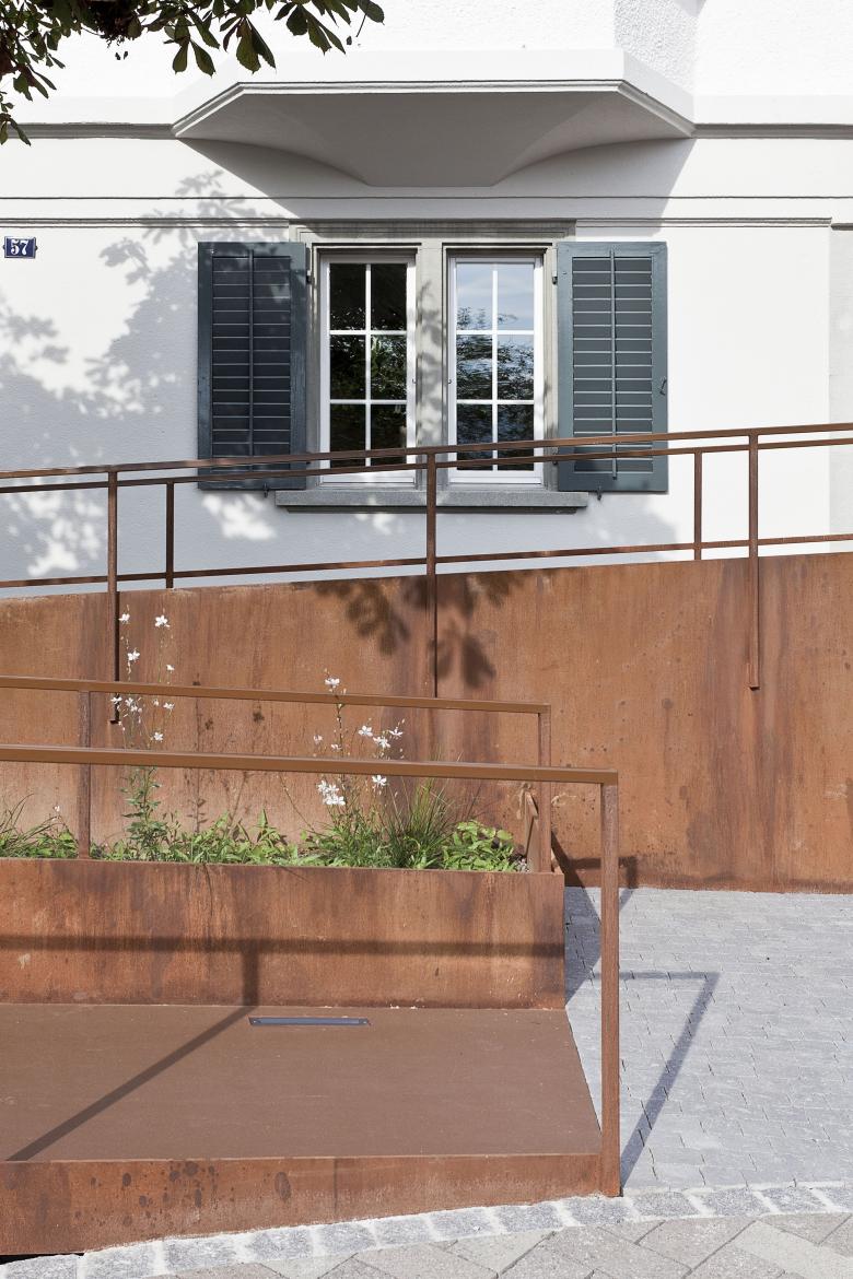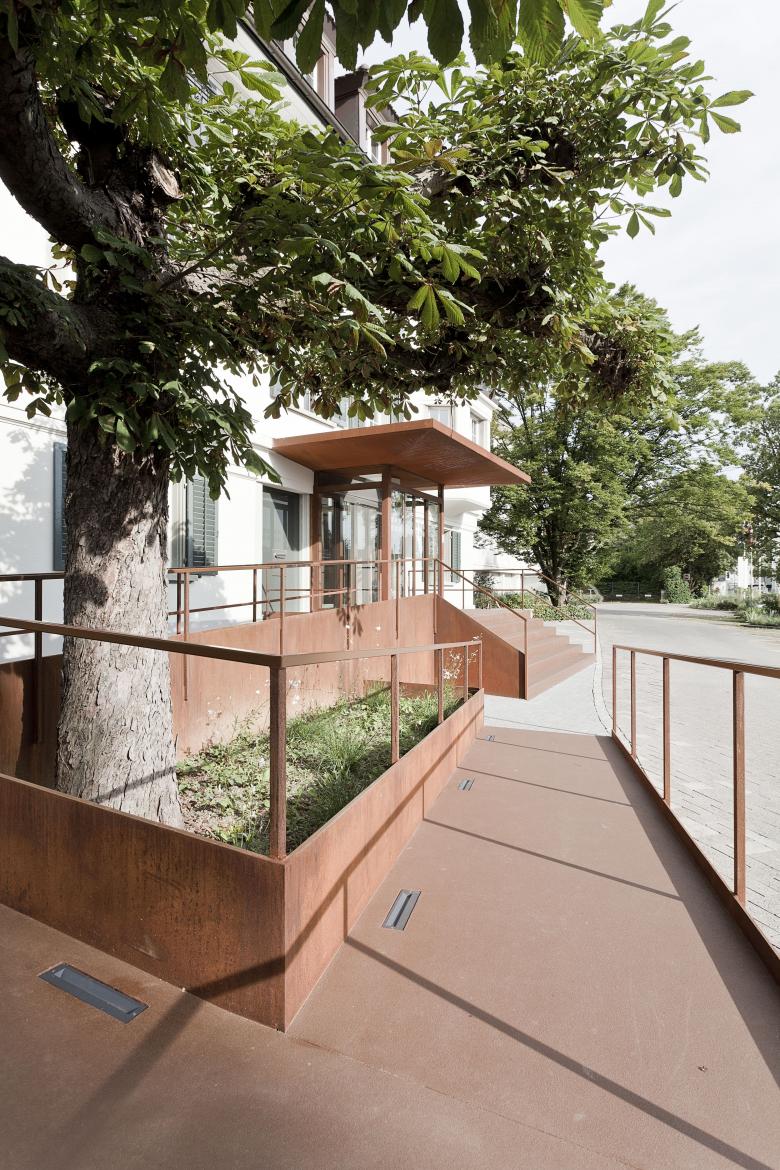 Für die barrierefreie Erschliessung gibt es im Aussenbereich neben der Eingangstreppe neu eine Rampe aus Cortenstahl. Bei ihrer Planung und ihrem Bau wurde darauf geachtet, dass der alte Kastanienbaum vor dem Gebäude erhalten und in das Ensemble integriert wurde.