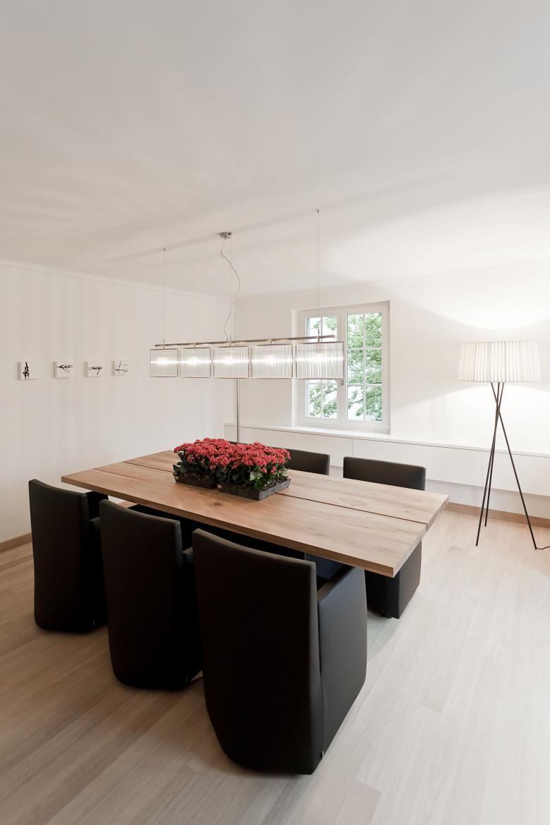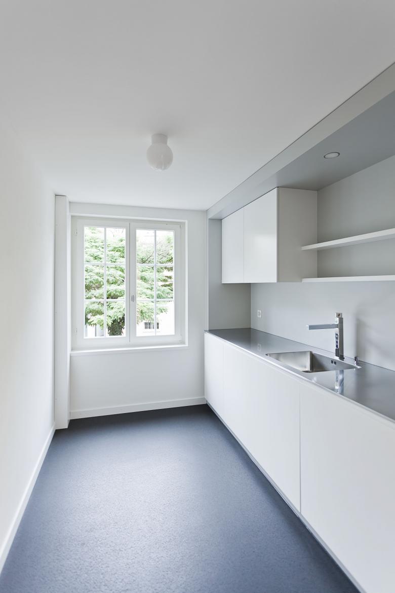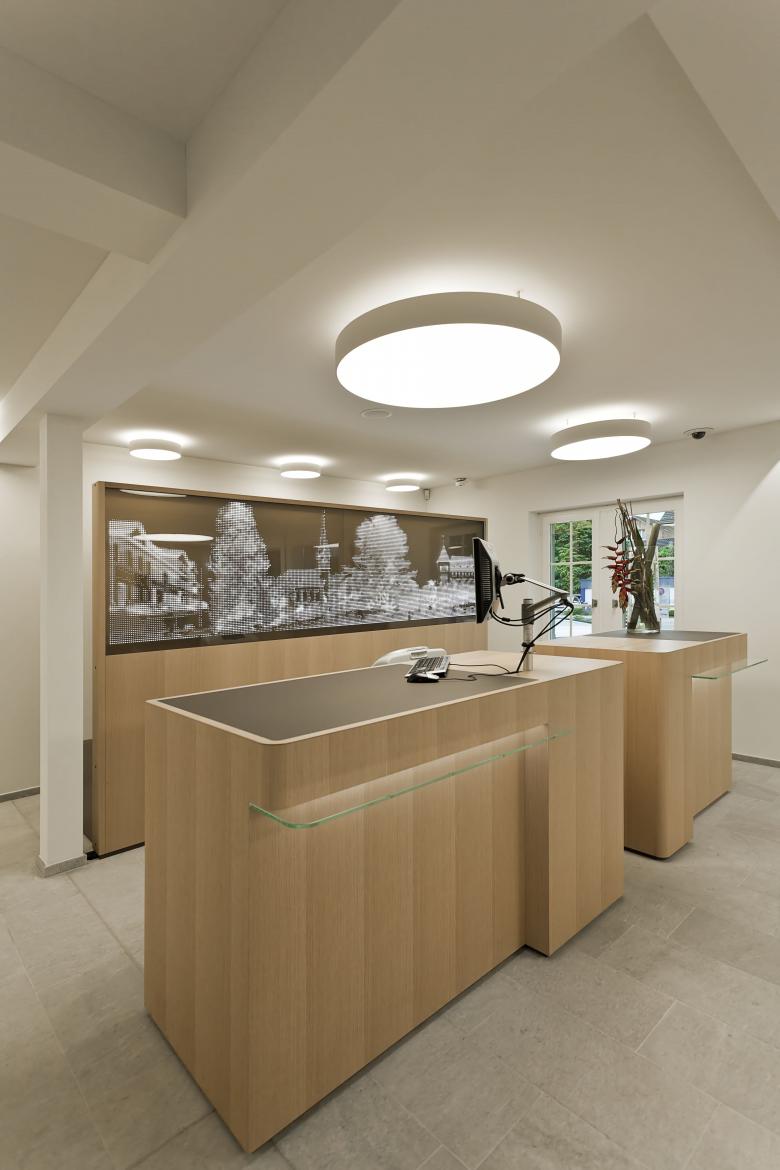 In der kurzen Bauzeit von nur einem halben Jahr wurden die Räume mit wenigen Materialien klar und freundlich gestaltet. Der Boden aus hellem Bündner Granit steht im Erdgeschoss in angenehmem Kontrast zum Empfangstresen aus Eichenholz. Mit den eingebauten Möbeln wurde versucht, so viele Mieterbedürfnisse wie möglich abzudecken und den Bedarf an weiteren frei stehenden Möbeln zu verringern.