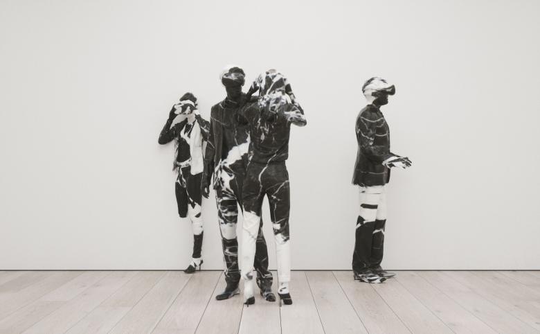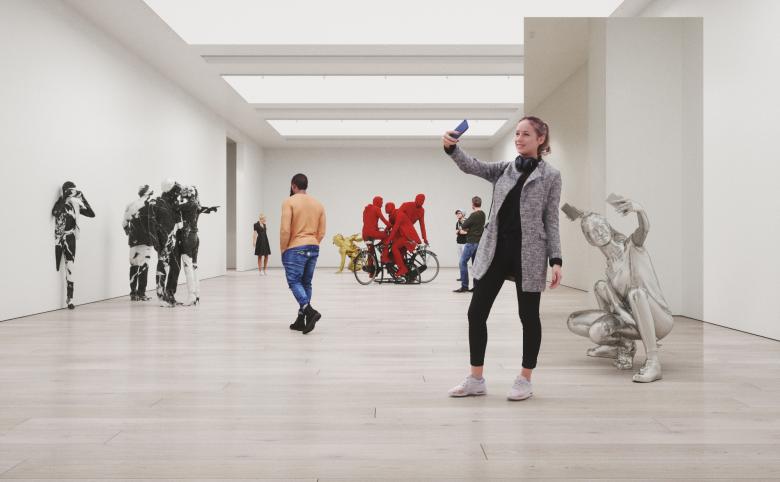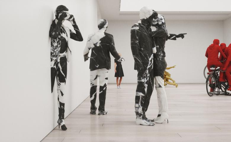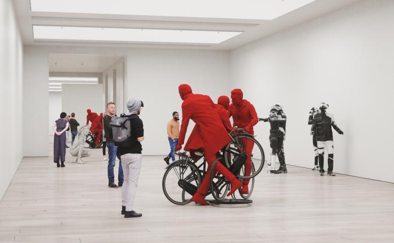 The exhibition consists of four mind warping sculptures - Woman Taking a Selfie Bisected by a Mirror (The Mirror Stage), Gold Hip-Hop Dancer In Relative Simultaneity, Virtual Reality Expedition in Grand-Antique d'Aubert (The Lovers), and The Three Red Bicyclists, or Menage Trois.
