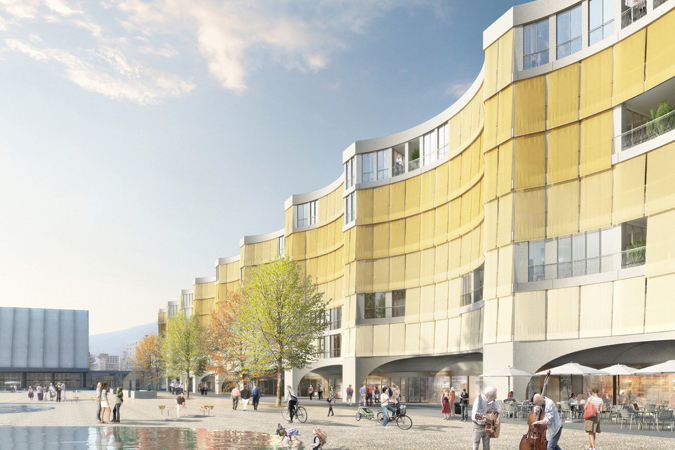 Die stadträumliche Dimension dieser Bauaufgabe verlangt nach einer aussergewöhnlichen baulichen Antwort. Wir suchen für das Gesicht zur Esplanade ein markantes städtebauliches Motiv, das sich im Sinne einer Initialzündung zu einem unverwechselbaren Identitätsträger des neuen Stadtquartiers entwickelt. Die geschwungene Fassade aus zwei wechselnden Bogensegmenten (A-B-A-B-) sorgt für eine Rhythmisierung über die gesamte Länge der Esplanade. Die vertikale Kannelierung setzt einen Kontrapunkt zur dominierenden horizontalen Ausdehnung der städtebaulichen Ausgangslage. Gleichzeitig erlaubt sie eine hohe Gebäudetiefe, sodass das gesamte Volumen im Perimeter Ost als Blockrand ganz ohne Hinterhofgebäude «in zweiter Reihe» realisiert werden kann. Sämtliche Wohnungen profitieren vom grosszügig geschnittenen Wohnhof. Für die innere Organisation generiert die bewegte Fassade vielfältige Blickbezüge zum öffentlichen Stadtraum.