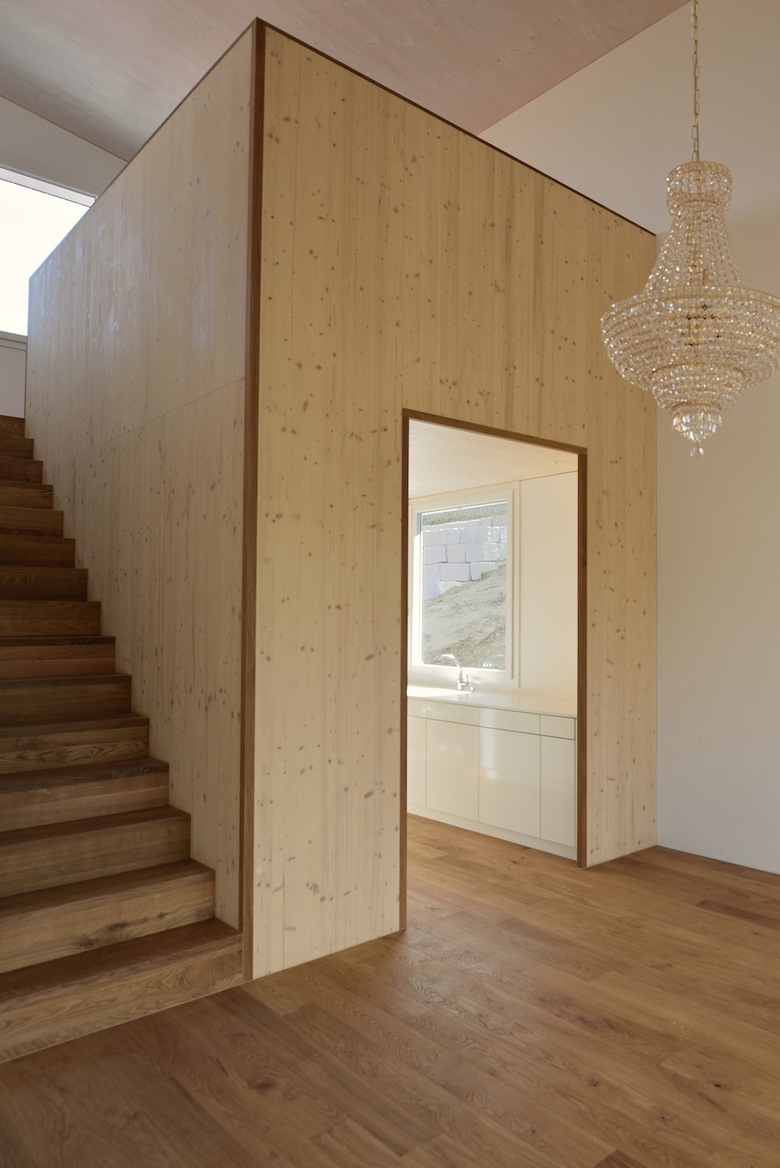 Das Einfamilienhaus Allmendstrasse erzeugt mittels zwei im Grundriss und Schnitt zueinander versetzten Kuben ein abgestuftes Volumen, welches sich präzis in die bestehende Umgebung und Hangneigung integriert. Gleichzeitig ermöglichen im Innenraum diverse diagonale Sichtbezüge eine grosszügige räumliche Wirkung innerhalb eines kompakten Grundrisses. Das Erd- und Dachgeschoss wurden in Holzelementbauweise über einem betonierten Sockel erstellt und mit einer vertikalen Holzlattung verkleidet.