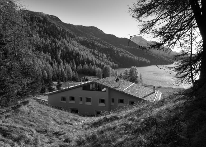 Das ursprüngliche Ferienhaus eignete sich nicht für die gleichzeitige Benützung zweier verschiedener Familien, sodass ein Neubau entstand. Die Liegenschaft befindet sich ausserhalb der Bauzone, an prominenter Lage. Dies hatte zur Folge, dass nur restriktive gestalterische Möglichkeiten bezüglich Ausnützung und Form erlaubt waren. Das Entwurfskonzept sah eine maximale Ausnützung auf zwei Wohn- und einem Galeriegeschoss vor sowie traditionelle und zeitgemässe architektonische Elemente zu kombinieren. Zudem wurden typische Elemente und Materialen aus der Gegend verwendet und neu interpretiert. Das mit Malenco Granit eingedeckte Dach als Elementbauweise ermöglichte im Innern einen stützenfreien Raum. Die Fenster wurden mit allseitig abgeschrägten, quadratischen, vorfabrizierten, fein strukturierten Betonelementen eingefasst. Die schlichte Fertigung der Fensterläden aus Lärchenholz sowie des Eingangtores erinnern an die traditionelle Bauweise. Der grosszügige Sulèr erschliesst die beiden Ferien- sowie die kleine Einliegerwohnung und dient als Ort der Ankunft. Um die einzigartige Aussicht einzufangen und innen eine helle Atmosphäre zu kreieren, wurde ein dominantes Panoramafenster gestaltet.