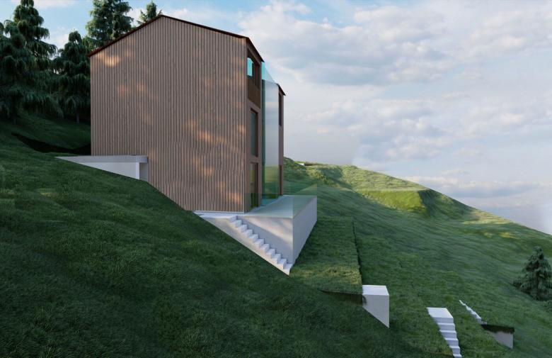 An bester Lage am Dorfrand mit Blick ins gesamte Tal wird ein Neubau in Holzbauweise mit einem spannenden Energiekonzept geplant, welches einen autarken Betrieb über die Nutzung der Sonnen- und Windenergie ermöglicht. Die präzise Setzung im Terrain, eine nachhaltige Bauweise und der hohe Innovationsgrad im technologischen Bereich prägen den Entwurf.