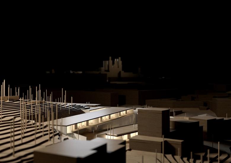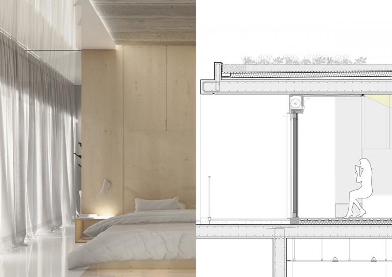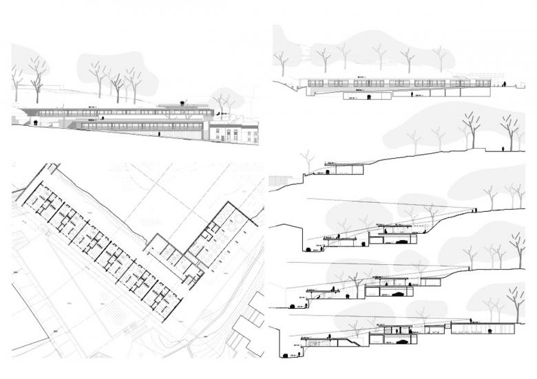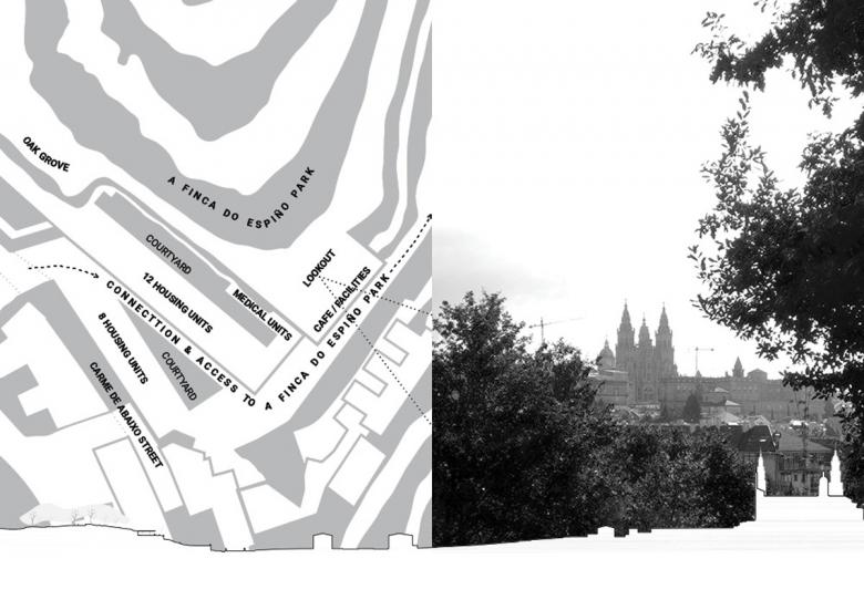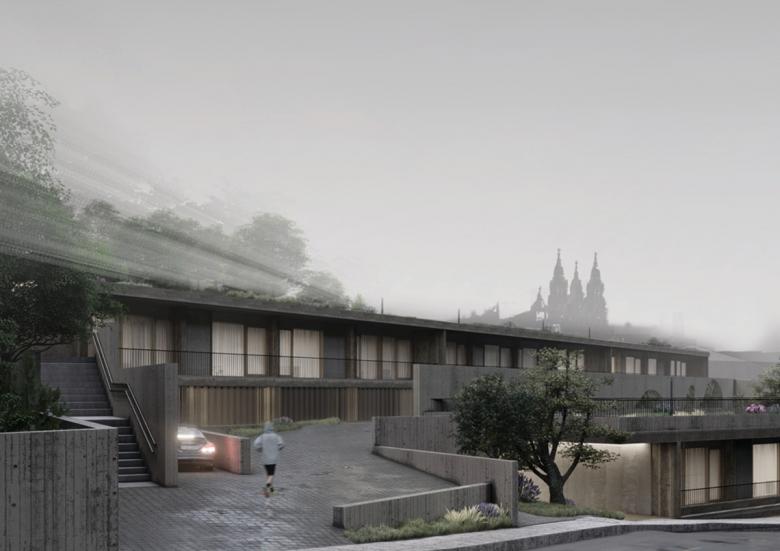 The senior cohousing project is an innovative residential complex designed to meet the needs of the elderly. Located in the Finca do Espiño park, the complex is built on a hill that overlooks the Santiago de Compostela cathedral. The complex features medical units, a cafeteria, and common areas that promote social interaction and community building. The project offers a solution to the housing and care needs of the elderly focusing on supporting their independence and enriching their quality of life. A series of terraced volumes that emerge from the topography are projected, digging into its geometry. 3 levels connected by an access road to the park that crosses the urban proposal, so that it is accessible throughout its route. One of the volumes is the cafeteria/common area that has a overlook on the roof that is part of the park. The lower volume is parallel to Carme de Abaixo street. In this part, there are 8 housing units, which are accessed through a large backyard full of vegetation. These housing units are mainly oriented for users who have greater independence, and therefore can take advantage of the more direct connection with the urban tissue. In the northern part, we find the second residential volume, with 12 residential units focused on those people with a higher level of dependence, closer to the common areas and to the medical units. These residential units are also accessed from the north side, in this case through an open courtyard walkway, which overlooks a slope full of vegetation. The units are designed with the elderly in mind, featuring accessible layouts and amenities that promote independent living. There are two types of housing units, a 65 m2 model for a couple, with a complete, adapted and equipped kitchen, dining room, accessible bathroom, bedroom, living room and dressing room; and another model for single occupancy, consisting of 41 m2 divided into an adapted kitchen and bedroom, accessible bathroom and storage.