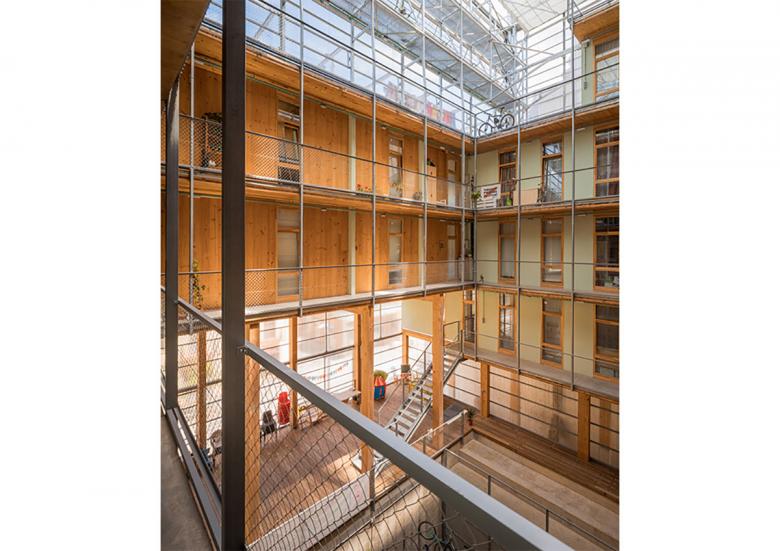 La Borda cooperative housing is a self-organized development to access decent, non-speculative housing. It contains 28 units (40, 60 and 75m²) and several community spaces: kitchen-dining room, laundry, multipurpose space, guestrooms, health space, storages, and exterior and semi-exterior spaces such as the patio, bike parking and terraces. The idea of a housing cooperative was born in 2012 as a project of Can Batlló driven by the community in the process of recovery of the industrial premises, and the neighborhood and cooperative fabric of the Sants neighborhood of Barcelona. The project is located on a public land of social housing, with a leasehold of 75 years. Located in Constitució Street, in a bordering position of the industrial area of Can Batlló with a facade to the existing neighborhood of La Bordeta. The project aimed to redefine the collective housing program, while creating sustainable building and including user participation at its center. La Borda's commitment to a community model opposed to the more traditional public or private promotions has made it possible to overcome some major limitations that are imposed on architectural projects. In the public sector, the fear of the future user, which is totally unknown, makes it impossible to introduce changes that may affect the way of living standardized. In the case of the private developers, the logic of the market that impoverish housing are imposed to facilitate their assimilation to a consumer object. The innovation of the development process has been key to work the architecture beyond its formalization. We identify five characteristics of this model that have a direct response in the project: self-promotion, right of use, community life, sustainability and affordability. The cooperative prioritized making a building with minimal environmental impact, both in its construction and its lifetime. Another basic objective is to eliminate the possibility of energy poverty among its users, which some of them suffered due to the high cost of energy. The initial strategy of the project to reduce energy demand has been the optimization of the program, renouncing the underground car parking, grouping services and reducing the surface of the houses. The maximum bioclimatic parameters have been introduced to achieve a very passive building, with solutions that involve active action by users in the climate management of housing. The result is almost zero energy consumption, and therefore, the comfort in the houses with the least associated cost. The structure of six floors is done using Cross Laminated Timber wood (CLT). This is a lightweight, high quality, renewable material in the environment that allows closing cycles, unlike conventional construction materials such as steel or concrete, whose production has a very high energy cost and are not renewable. La Borda is currently the highest building constructed using wood structure in Spain.