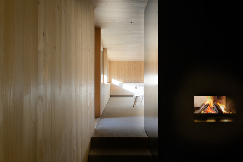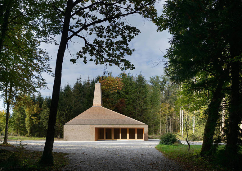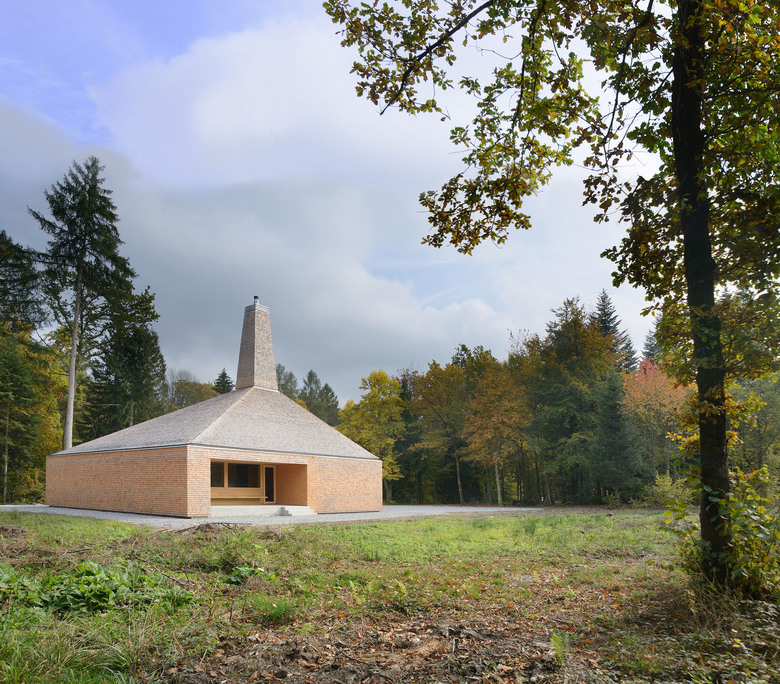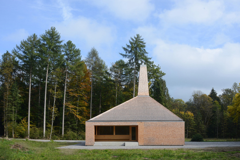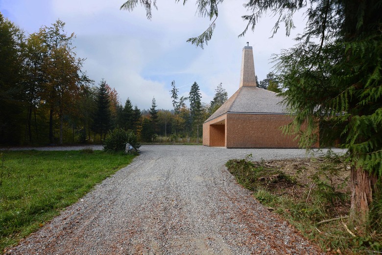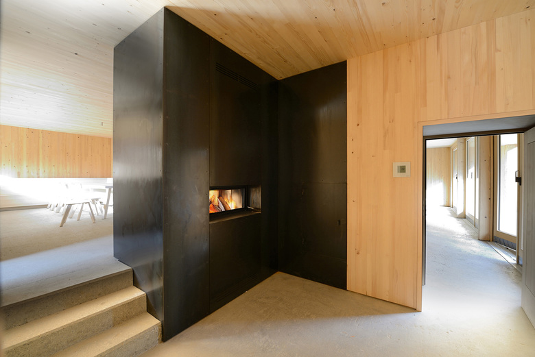Der Entwurf vereinigt diese Funktionen in einem kompakten Volumen, wobei den einzelnen Bereichen jeweils andere Seiten des Hauses zugewiesen werden. Eine eingezogene Loggia dient jedem Bereich als eigenes Vorfeld. Dach und Wand schließen bündig ab, das Gebäude soll einen aufgeräumten Eindruck machen. Ein besonderes Merkmal ist der gemütliche Aufenthaltsbereich für die Mitarbeiter mit einem offenen Kamin, der mit Stückholz beheizt wird. Um diese Aufenthaltsqualität zu betonen, wird der Kamin als weithin sichtbares Zeichen inszeniert.