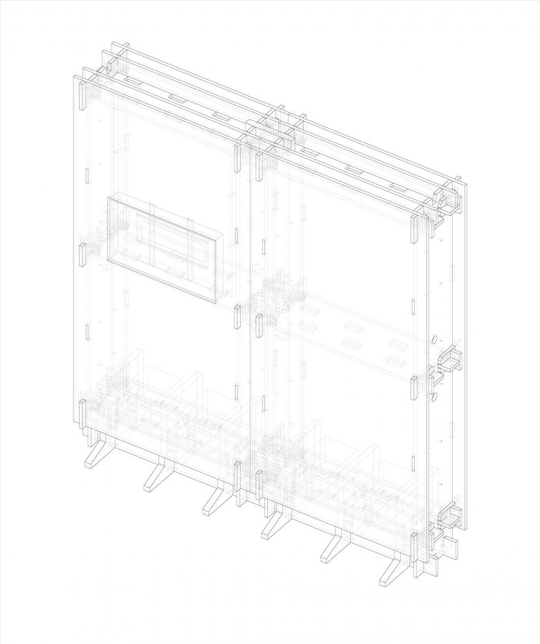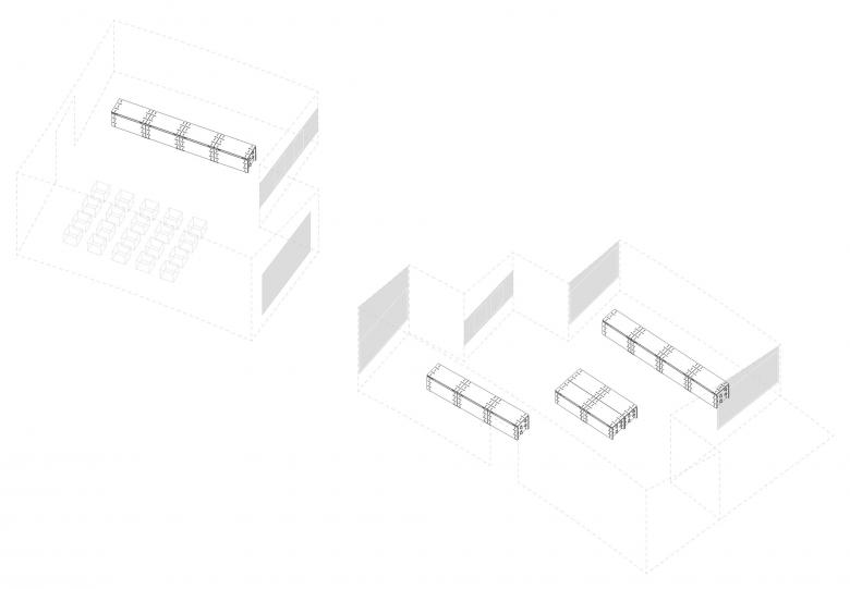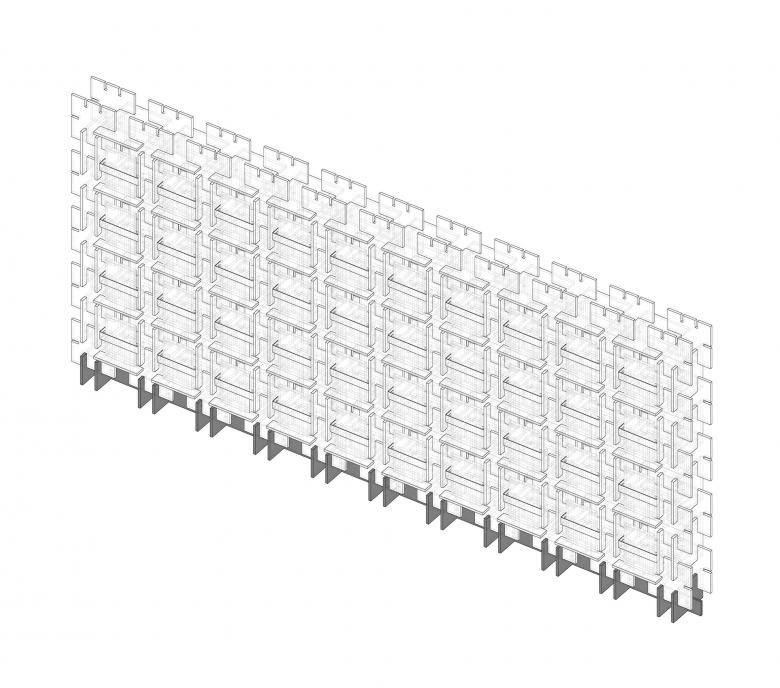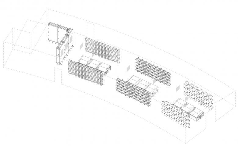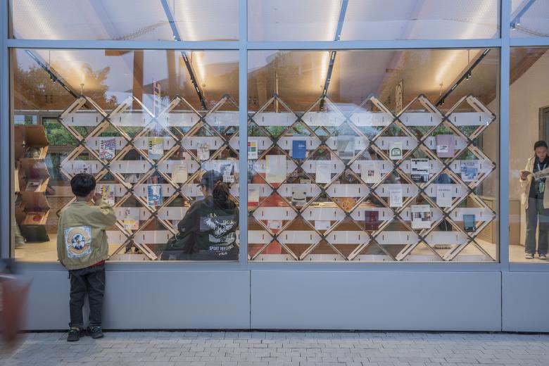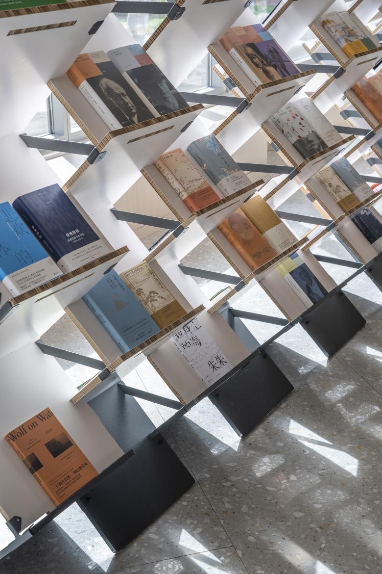 As the 18 different independent bookstores participating in the exhibition have various concepts, it is very important to create diversity through effective design methods, which facilitates not only the distinction between bookstore brands, but also the organization of the exhibition. According to the size of the three spans in the building, three different methods to assemble the display bookshelves were worked out, including vertical-horizontal plugging, front-rhombus plugging and lateral-beveled plugging. In this way, each section of the bookshelves between the three spans is different.