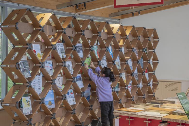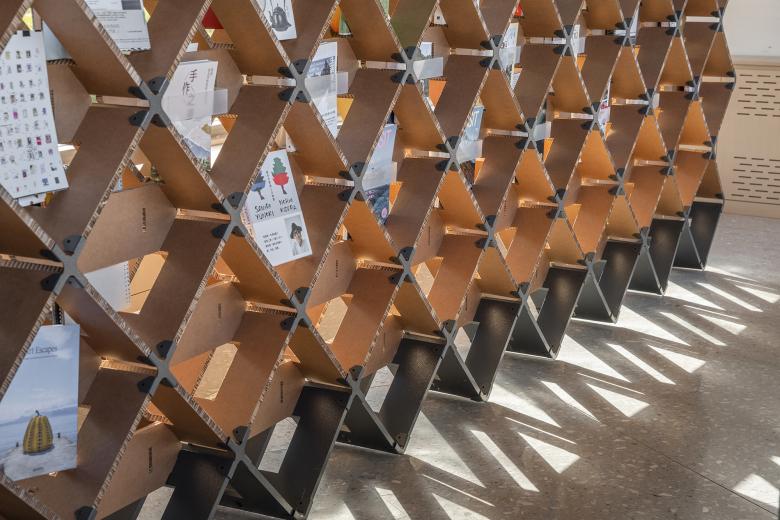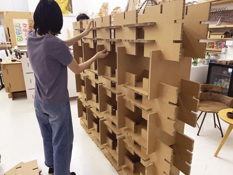 The project did not adopt the common way of screen printing on the exhibition wall, nor did it use industrial paper pasted directly on the wall, but chose to press the corners of Yukou Paper with nails on corrugated cardboards. The construction method provides more convenience for the recycle and reuse of the corrugated cardboards after exhibition, and realizes high reversibility of the materials. This is consistent with the curator and design team's dedication in sustainable practice for a long time.