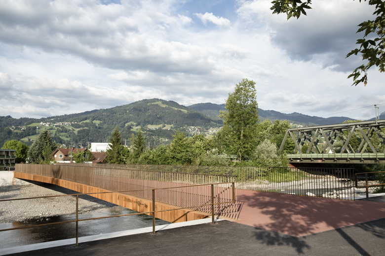Die Dornbirner Ache verläuft tangential zum Zentrum, bildet so gesehen die Schnittmenge zwischen Stadtmitte und den peripheren Ortsteilen. Flussbett und Uferwege sind ein Naherholungsgebiet für beide Seiten; der im Stadtbereich durch Steinwälle im Zaum gehaltene Naturraum animiert zum Fischen, Baden, einsam oder gemeinsam Sein und betört, je mehr stadtauswärts, durch seinen säumenden Auwald. Im Bereich Birkenwiese gibt sich die Ache schon idyllisch umrankt, staudenbewachsene Böschungen machen den Flussraum HQ 100 sicher, Bruchschotter und Wasserlauf formieren in stetigem Wandel begriffene Kiesbänke. Was auf der einen Seite Einfamilienhausquartier ist, ist auf der anderen multifunktionales Mischgebiet. Dem Fahrrad- und Fußgängersteg südseitig unmittelbar vorgelagert ist das neue Seniorenheim Birkenwiese mit seinen weiß geschlämmten Backsteinen und den rostrot lasierten Holzfenstern. Neben dem Naturraum nimmt die Gestaltung der Brücke auch hier Anleihen und verknüpft das Bauwerk mit dem Umfeld.
