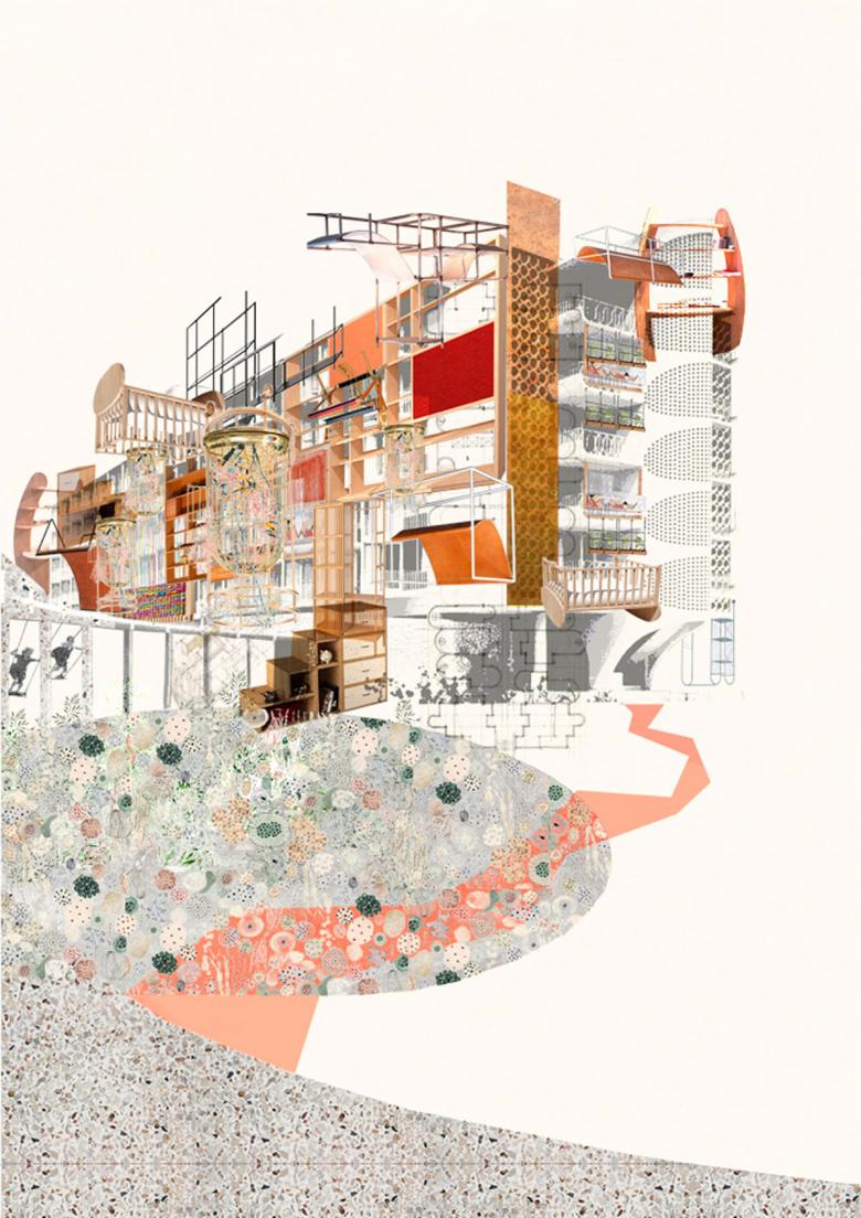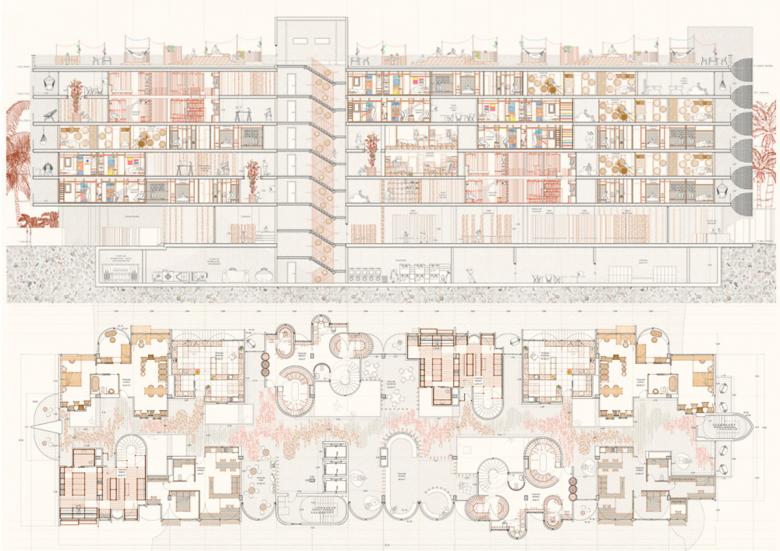 The renovation of the building seeks to call for the reduction of consumption, by reusing materials that can be salvaged from landfills and recycling centers in the area.The project aims to transform the hotel into a “refuge” where manufacturing trades can be sheltered, through slow, sustainable and quality production processes. Annually, Ponce hosts a Crafts Fair, in which artists and craftmen from all over Puerto Rico gather to display their products. For this reason, the project creates a space for coexistence, where housing can be combined with public space, for exhibitions and teaching crafts. 5 types of handicrafts are selected to be housed in the building’s dwellings: pottery, weaving, cabinetmaking, basketry and goldsmithing, developing the first two. The entire plot is redesigned, rebuilding the sports and parking areas, the swimming pool, and creating new gardens by using native vegetation.The ground floor preserves part of its original geometry, considering itself as a public plant with attractive activities for the citizens, such as a café, terraces, stands for selling the products of the residents, and a large multipurpose area to implement craft workshops or to place the Ponce’s Craft Fair. The upper floors are intended for long-medium stay homes for artisans, designing 5 typologies adapted to the manufacturing process of each of the crafts. The plan breaks with the generic scheme of hotel rooms making dwellings in one or two floors. They are placed in a way that generates common spaces between them for the craftmen. This, along with new openings in the slab, helps cross ventilation, which is essential in tropical climates. The façade has different elements to protect the building from the solar radiation, such as setbacks, awnings or fixed slats. Each dwelling is designed with different materials, which may be handled during construction by residents, for their own homes, as well as those of others, providing them a job before living there, and during their stay. Materials are selected and rescued from recycling centers to treat them and turn them into construction material.