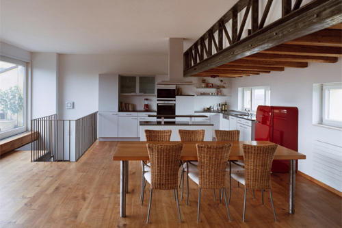 Das Mehrfamilienhaus wurde 1898 gebaut entlang der Eisenbahnlinie nach Wiedikon und weiter dem See entlang. Später wurde die Eisenbahnlinie tiefer gelegt: ein Geländeeinschnitt. Nach wie vor ist die Seebahnstrasse eine stark vom Durchgangsverkehr belastete Strasse. Darum wurde versucht, den Dachausbau Richtung Hof und damit Richtung Süden auszurichten. Auch aus denkmalpflegerischer Sicht wurde darum die bestehende Strassenfassade nicht verändert sondern nur mit hochwertigen Schallschutzfenstern ausgerüstet. Hofseitig wurde dem neuen Wohnzimmer im Dachgeschoss eine über die ganze Hausbreite gehende Terrasse vorgelagert. Dadurch entsteht ein Panoramafenster mit Blick auf die Silhouette des Üetlibergs. Der oberste Lauf des Treppenhauses wird zur internen Treppe der MaisonetteWohnung. Das ursprünglich oberste Wohngeschoss wird damit zum Schlafzimmergeschoss mit den nötigen Nebenräumen wie Bad und WC. Das ermöglicht, das neue ausgebaute Dachgeschoss als einen Raum erlebbar zu machen, eine unerwartete Überraschung für den erstmaligen Besucher.