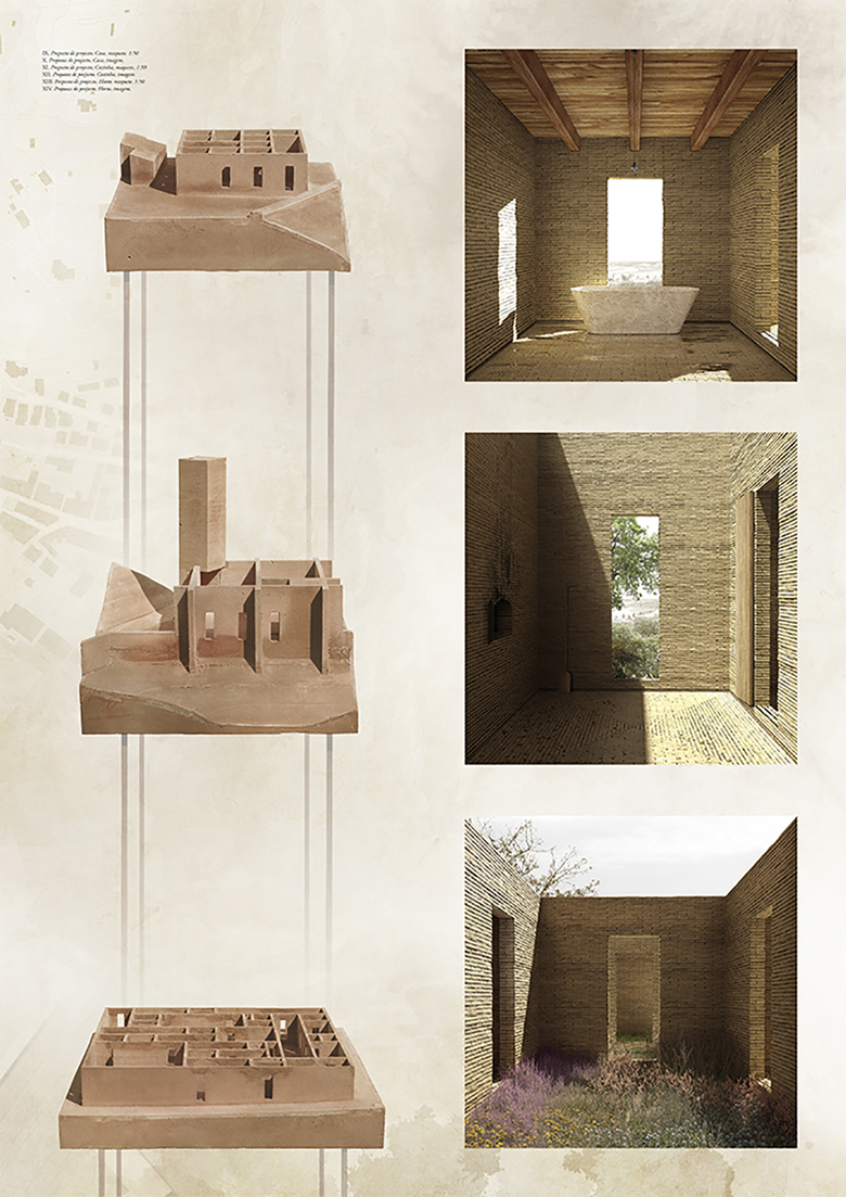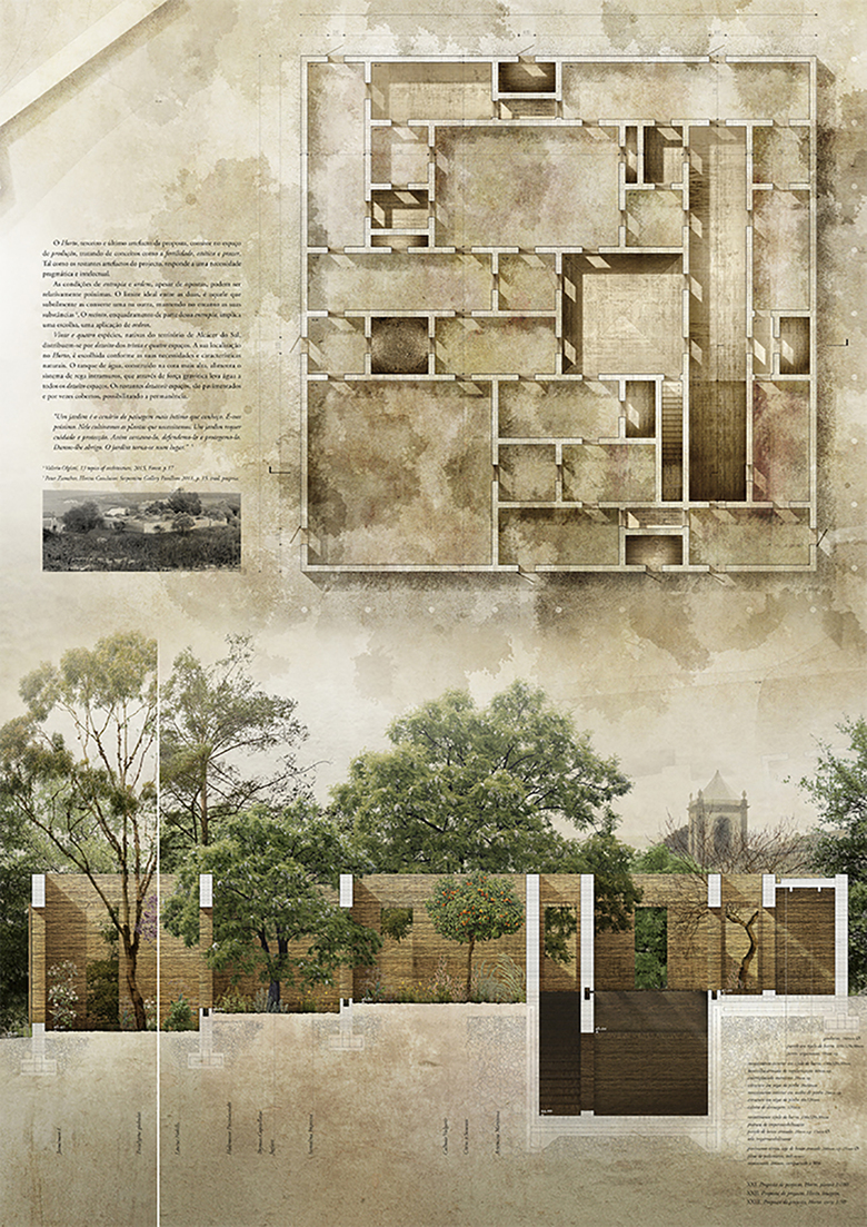 The first of the three built artifacts, the House, constitutes the private and introspective part of the project, giving answer not only to the most intimate and phisiological needs of the individual, but also to imaterial needs, from the sphere of the reflection. Placed in a void between houses and the pre-existent wall, this artifact intends to retract itself, giving strength to the private. The House is divided hierarchically: one common space, four sleeping spaces, four hygiene spaces, one bathing space, one courtyard, and one space of transition. Each one of the interior spaces has one opening to the outside. The Kitchen, by opposition to the first artifact, consists in the gathering place. The place where the Kitchen is built, located at the ancient doors to the East of the walled city and where in times was located the islamic butchery, is a nuclear point in the internal circulation of Alcácer do Sal. Keeping an identical language, the drawing of the space extends from the interior to the public dimension, summoning the gathering. The chimney, space of fire, draws a visible landmark in the landscape, while the extensions of the outer boundaries generate spaces of permanence. On the inside, the object divides itself in two spaces: the first shelters the common washbasin and an open courtyard which contains the traditional oven, the second, consists in the space for cooking and eating. The Garden, third artifact of the proposal, consists in the space of production. Twenty four floral native species of Alcácer do Sal, are distributed through eighteen of the thirty four spaces, which follow the topography of an existent agricultural area trough the variation of the floor's height. Sixteen of these spaces are paved and sometimes covered. Built in the heighest level, a water tank feeds a system of intramural irrigation, which through gravitional force conducts the water to the spaces with vegetation. The spaces of the project are conceived from the composition of one element which is often used in the southern region of Portugal, the handmade brick.