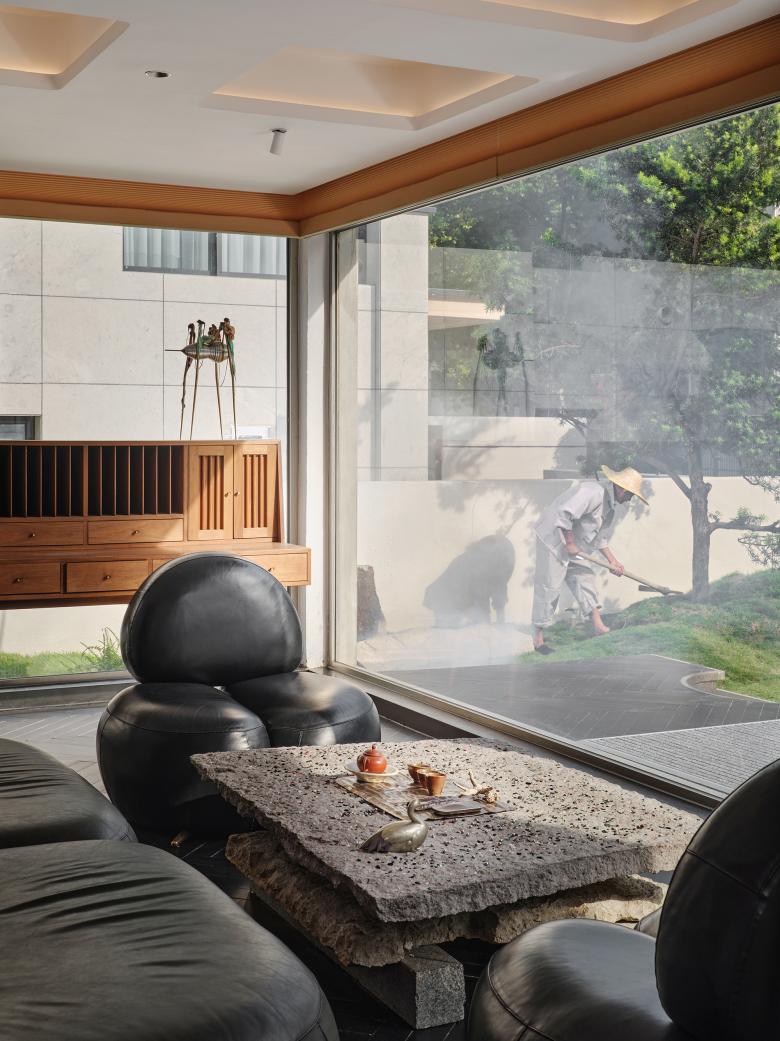 The space has unhindered access to outdoor sceneries in all directions. The reception tearoom at the entrance accommodates tables made of stacked raw stones, perpetuating the coarse texture of the courtyard. In the sunken meeting space one meter below the floor, the circular seating area echoes the curved ceiling, strengthening participants' rapport during discussions. The sunken garage is transformed into a large table that connects the space and serves as an immersive handicraft workshop.