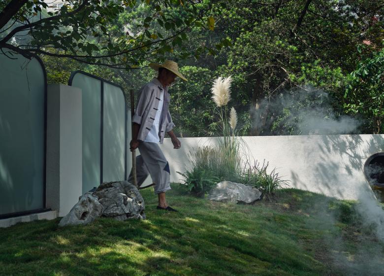 In the center of this landscape, a shallow pond in the shape of a ring is created, with the inner and outer circles forming concentric round shapes. Four giant rocks distributed in the pond, on the gravel, ground and lawn blend into one another, signifying a symbiosis of the elements, while introducing "time" into the scene with the image of a clock. In both artistic creation and agricultural cultivation, the most luxurious thing is the waiting period.
