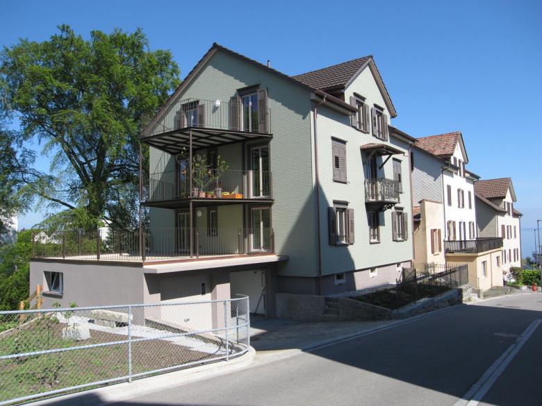 Das in die Jahre gekommene Wohnhaus bildet den Auftakt zur einer kleinen, charmanten Häuserzeile an steil abfallender Strasse. Der tiefgreifende Umbau umfasst neben der energetischen Sanierung der Gebäudehülle auch eine komplette Innensanierung der 3 Geschosswohnungen. Der einseitige Giebel auf der Ostseite wurde in gleicher Art auch westseitig erstellt und so entstand nun ein klassisches Kreuzgiebeldach. Auf der bestehenden Garage steht neu ein Balkonvorbau mit trapezförmigem Grundriss. Die sorgfältige Wiederherstellung der feingliedrigen Fassade war oberstes Gebot: Die originalen Fensterläden, der Hauseingang sowie der kleine Ostbalkon wurden restauriert, die Fenster und Fenstereinfassungen dagegen sind allesamt neu, aber originalgetreu nachkonstruiert. Der hübsche Vorgarten, eingefasst von einer Sandsteinmauer mit aufliegendem geschmiedetem Geländer, wurde nicht wie üblich zu einem öden Verbundstein-Parkplatz degradiert, sondern konnte wiederhergestellt werden als grüne Zierde dieses ehrwürdigen Wohnhauses in klassischem Landhausstil.