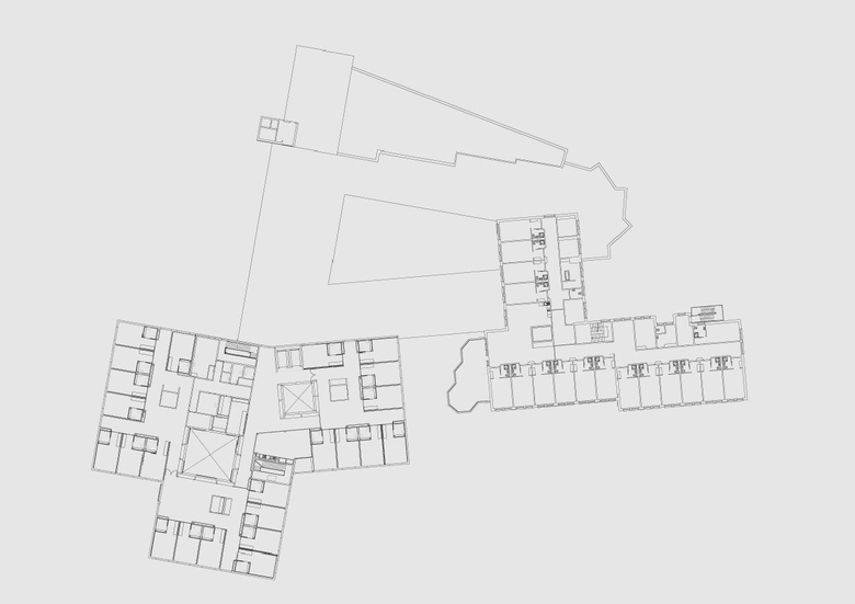 Ausgehend von der Lektüre des Ortes und den betrie- blichen Anforderungen werden die Bestandsbauten und der Neubau zu einem symbiotischen Ensemble vernetzt, das Synergien schafft. Die öffentlichen Nutzungen sind in einem Sockelbau organisiert, der zum Bestand ver- mittelt, während die Pflegegeschosse als kompaktes Volumen in Richtung Landschaftsraum angeordnet sind.