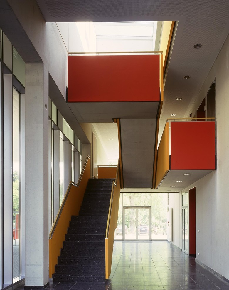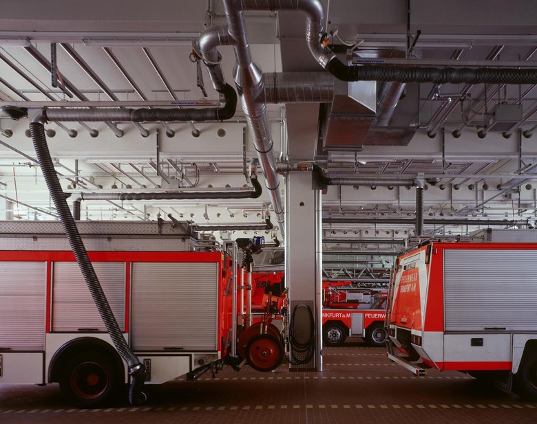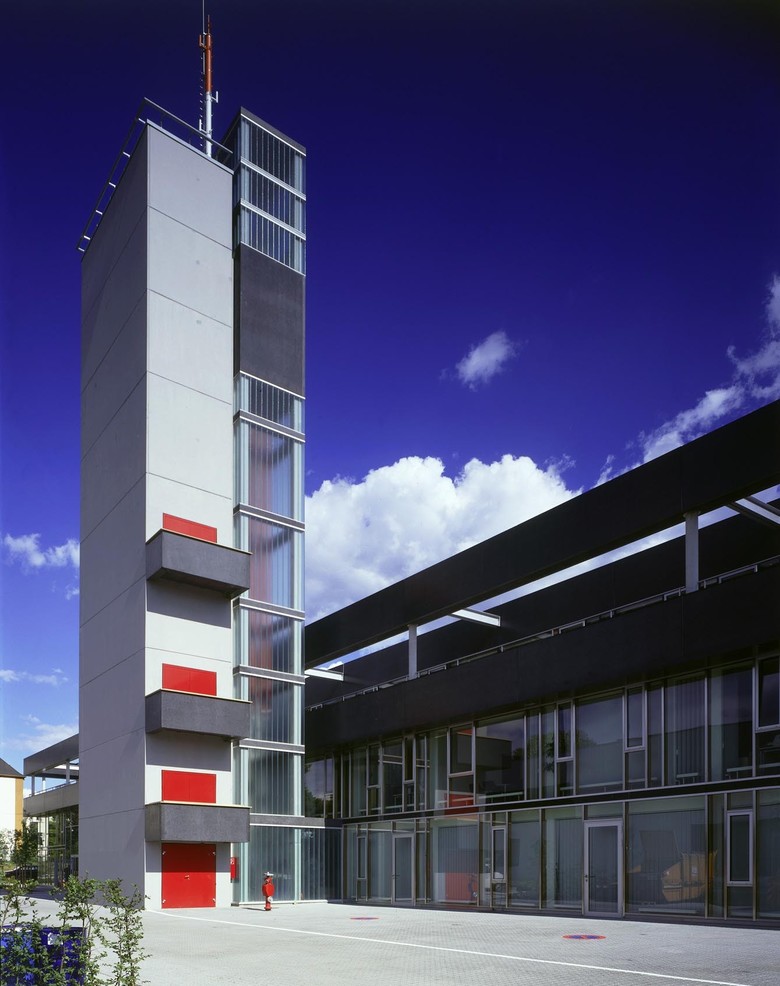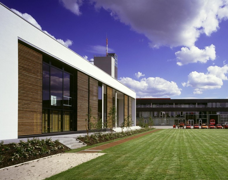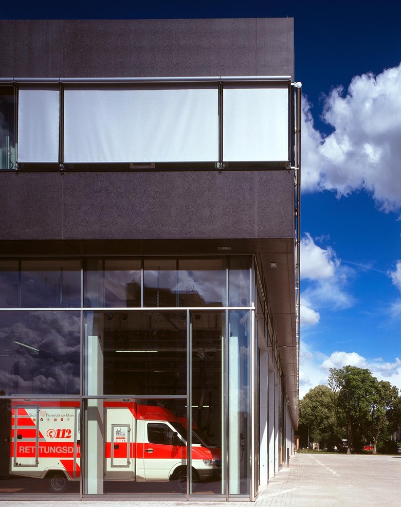 Aus organisatorischen und einsatztaktischen Überlegungen war für die Frankfurter Berufsfeuerwehr der Neubau eines integrierten Zentrums für den Brandschutz, Katastrophenschutz und Rettungsdienst erforderlich. Die besondere Aufgabe der Feuerwehr und das integrative Konzept des Zentrums bilden in den klassischen, architektonischen Metaphern - Hof - und - Dach - das architektonische Thema des Entwurfes. Das zweigeschossige Hauptgebäude gibt der Feuerwehr mit seinen klaren und eindeutigen Raumkanten eine noble Präsenz im Stadtraum, ohne seine Umgebung zu dominieren. Restaurant, Sporthalle und die Gästeappartements sind in einem separaten Baukörper angeordnet. Diese Räume sind sowohl für außerbetriebliche Veranstaltungen als auch für den Einsatz im Katastrophenfall vorgesehen. Die Fassaden der beiden Baukörper sind gekennzeichnet durch den Gegensatz der schwebenden Horizontalen des Hauptgebäudes, betont durch die schwarzen, polierten Betonfertigteile und den kubischen Charakter des zweiten Baukörpers aus weißem Putz.