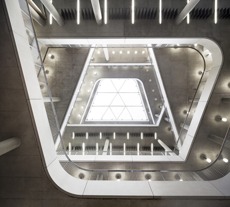 The respective floor plans surrounding the atrium have visual connections from one floor to the other, making the atrium a dynamic centre and the heart of the College. The large atrium, which on some floors extends all the way to the façade, enhances the relationship between the inside and the outside. It offers light-filled, open and inclusive spaces which encourage the interaction between students.