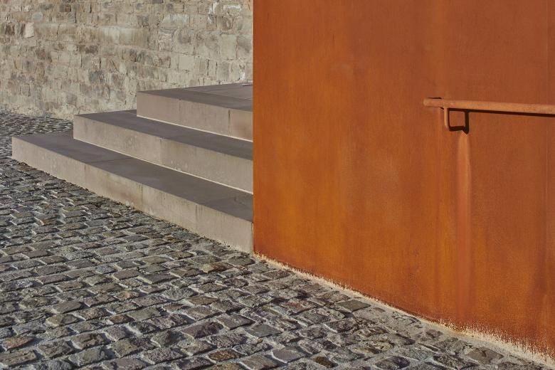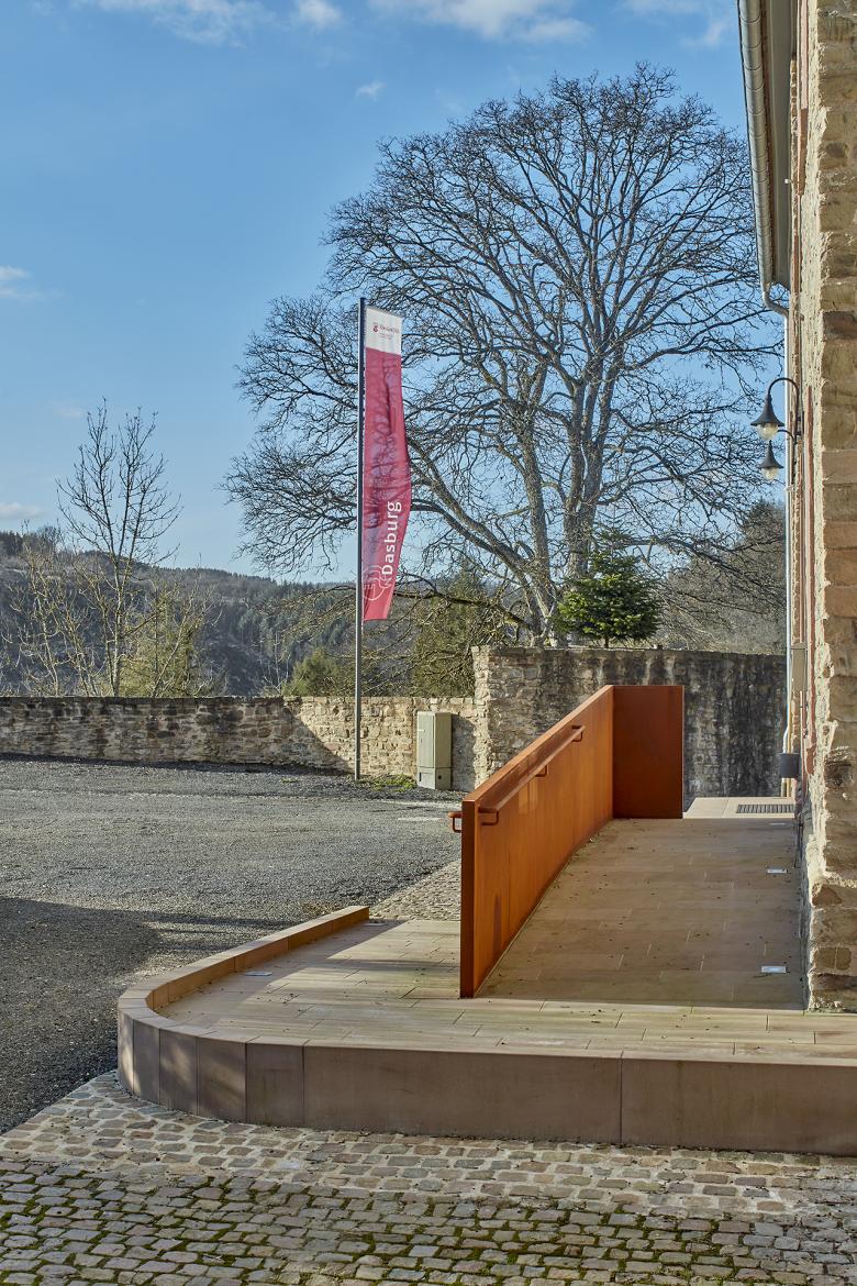 Corten-Stahl, in der Eifel vorkommender, ortsüblicher Naturstein sowie die Intergration von Leuchtkörpern geben eine zeitgemäße Antwort auf den Bestand. Gleichzeitig definiert das Rampenbauwerk den Übergang zwischen dem Dorfgemeinschaftshaus und den Ruinen der Dasburg.