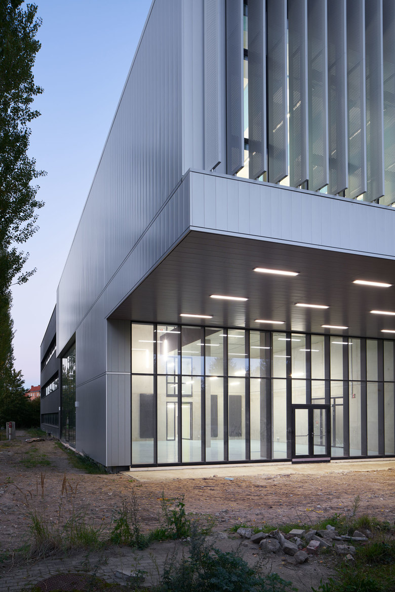 Lebendige Fassade, Schaufenster in die Forschung – Transparente Fassaden geben einen Einblick in Forschungstätigkeiten und öffnen sich bewusst dem Außenraum. Anders als bisher, findet damit die Forschung nicht hinter verschlossenen Fassaden statt, sondern wird sicht- und erlebbar. Zusammengehalten wird die gewonnene Einheit von Neubau und bestehenden Gebäuden durch ein durchlaufendes Fassadenband. Die Fassade besteht aus eloxierten, weiß-silbernen Aluminiumblechpaneelen, die als fest montierte Paneele vor geschlossenen Wandscheiben liegen oder als flexible Klapplamellen vor verglasten Bereichen. Als Klapplamellen dienen sie dem Sonnenschutz. Durch die unterschiedlichen Positionen und Ausrichtungen der Sonnenschutzlamellen bietet sich ein abwechslungsreiches Bild für den Betrachter. In den offenen Bereichen wird der Sonnenschutz durch eine Sonnenschutzverglasung gewährleistet.