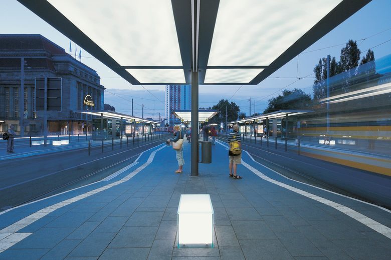 Als ein Objekt, das sich zwischen Architektur und Design bewegt, ist die Haltestelle ohne Zweifel stark von ihrer Ausstattung geprägt. Dazu gehören 8 Anzeigentafeln, 8 Fahrscheinautomaten, 2 Kioske und 47 Sitze. Die für je 2 Personen gedachten Glasblöcke sind von innen beleuchtet. An den Längsseiten stellen sie, auf das Wesentliche ihrer Gestalt beschränkt, viele Sehenswürdigkeiten der Stadt Leipzig dar, unter ihnen etwa die Thomaskirche und die Nikolaikirche, das Gewandhaus und das Schillerhaus, den Wildpark und den Zoo. Ob Bewohner oder Besucher, wer hier auf Bahn oder Bus zu warten hat, bekommt eine Einladung zur Erkundung der Stadt.
