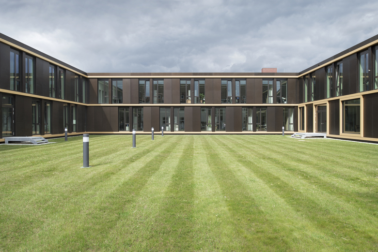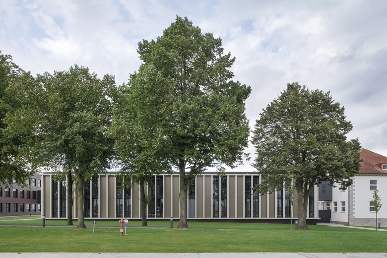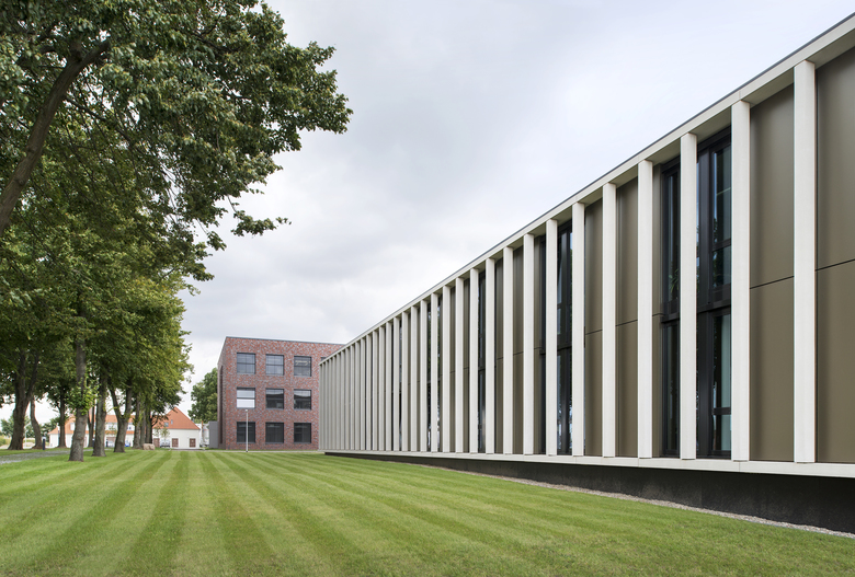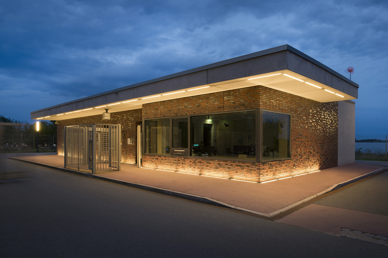 Funktionalität – Die betrieblichen Rahmenbedingungen und deren Anforderungen an die Funktionalität bestimmten den Entwurf des Layouts in hohem Maße. Das Doppelgebäude von Labor und Stall bildet den Kern der Anlage. Der Komplex besteht aus einem übertiefen Baukörper für die Tierhaltungsräume und einem schmalen Riegel für die Labore. Die Sicherheitsbereiche werden von West nach Ost ansteigend angesiedelt. Im Laborgebäude im Westen beginnend mit der Zellbank, Laborbereich L2/S2, darin integriert der Bereich L3**/S2, anschließend der Bereich L3/S3 und als Abschluss der Hochsicherheitsbereich L4/S4. Im Stallgebäude sind es die Bereiche L2/S2, L3**/S2, L3/S3. und L3+/S3. Der Laborbereich L3+/S3 wird direkt an den Letzteren angekoppelt und bildet den Abschluss gegen Osten. Die Medienzentrale mit Energieerzeugungsanlagen wird im Lastschwerpunkt zwischen die Bereiche L2/S2 und L3**/S2 eingeschoben und erhält einen eigenen Wirtschaftshof. Das Laborgebäude verfügt über eine klassisch dreibündige Struktur. Die Nutzflächen verteilen sich auf die drei oberirdischen Geschosse. Im übertiefen Stallgebäude befinden sich die Nutzflächen vorwiegend im Erdgeschoss, Ober- und Untergeschosse werden von den technischen Installationen beansprucht. Die Gebäude sind als Betonmassivbauten konzipiert. Aufgrund der hohen Anforderungen an die Unterdruckhaltung und Gasdichtigkeit werden die Außenwände als homogene Stahlbetonscheiben ausgebildet. Vorgeblendet ist eine hinterlüftete Klinkerschale.