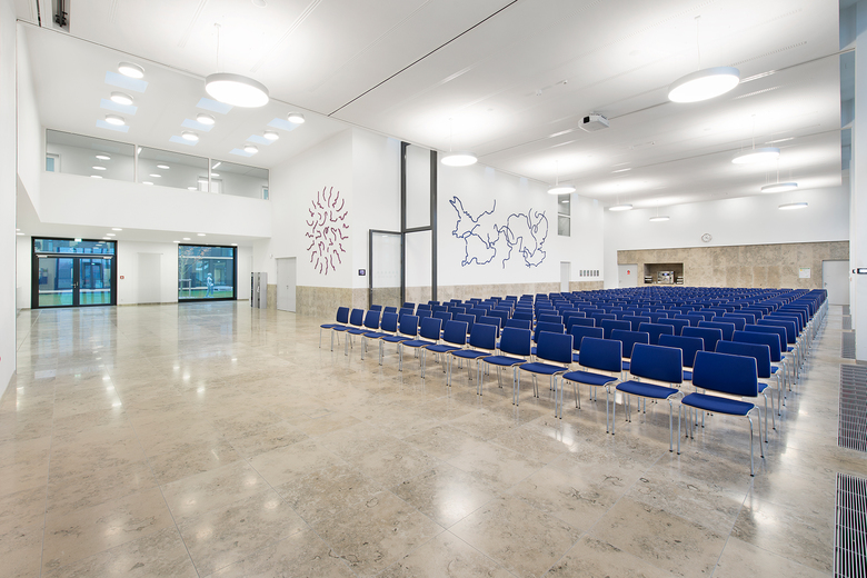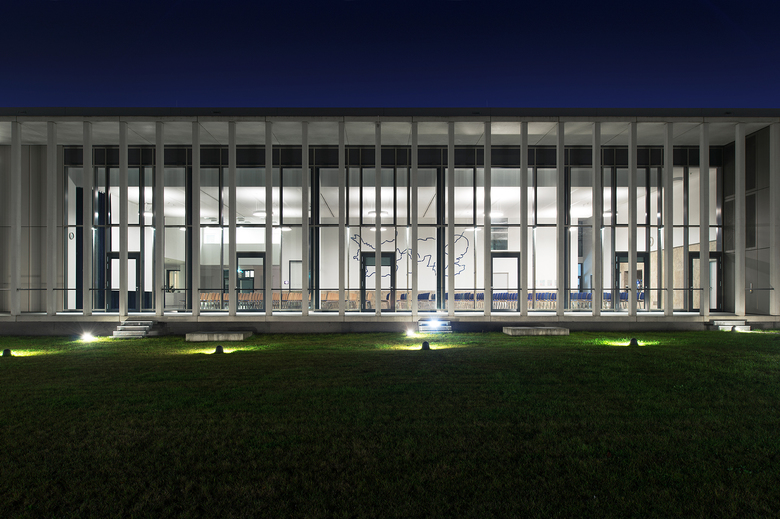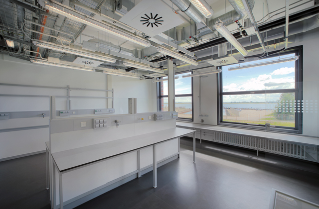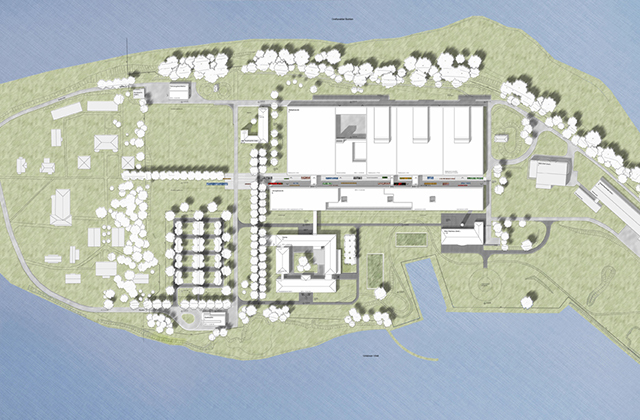 Architektur – Die Anordnung der Neubauvolumen entwickelt das städtebauliche und landschaftsarchitektonische Thema von Offenheit und Geschlossenheit, Weite und Enge weiter. Es entstehen verdichtete Orte mit einer eigenen, spezifischen Identität und Orientierung. Dies wiederum erlaubt es, weite und offene Räume zu gestalten und die Insel selber als eine fließende Landschaft zu begreifen. Ein wichtiger Aspekt für die Formulierung der Architektur ist der stark durch horizontale Linien geprägte Kontext. Alles ist flach und in die Länge gezogen. Einzelne Bäume stehen turmartig in der Landschaft, ein Kamin oder ein Kirchturm, wie derjenige von Gristow, wird zur wichtigsten vertikalen Landmarke. Der Aufriss der großen Bauvolumen der Labor- und Tierhaltungsgebäude präsentiert einen flachen und lang gestreckten Baukörper. Dachaufbauten integrieren sich in die klar und scharf geschnittenen kubischen Formen, die neue Schornsteinanlage setzt als Entsprechung und Gegenstück zum bestehenden Kamin des alten Heizhauses ein einprägsames vertikales Zeichen. Auf der Nordseite schließt das Nordkliff und dessen dichter Bewuchs die räumliche Sequenz ab und definiert den Übergang zur See. Gegen Süden bildet die dreigeschossige und ruhige Laborfassade eine klare Trennlinie zum frei fliessenden Landschaftsraum davor. Dieser dient als „Bühne“ für die Situierung des Karree-Ensembles - bestehendes Hauptgebäude und den Ersatzneubauten - sowie des alten Heizhauses. Labor- und Stallgebäude bilden einen zusammenhängenden Komplex. Darin eingelassen ist das schalenförmige Element der „Inneren Straße“. Hier sind die Eingänge angeordnet, Brücken zwischen den Obergeschossen verbinden die beiden Bauten. Auf diese Situation der Verdichtung reagieren die Erdgeschossfassaden mit Offenheit und Transparenz. Die äußeren Fassaden hingegen antworten in Form einer Lochfassade zurückhaltend und ruhig auf die Weite und Offenheit der umgebenden Landschaft.