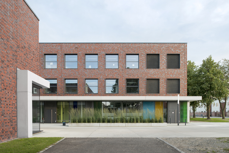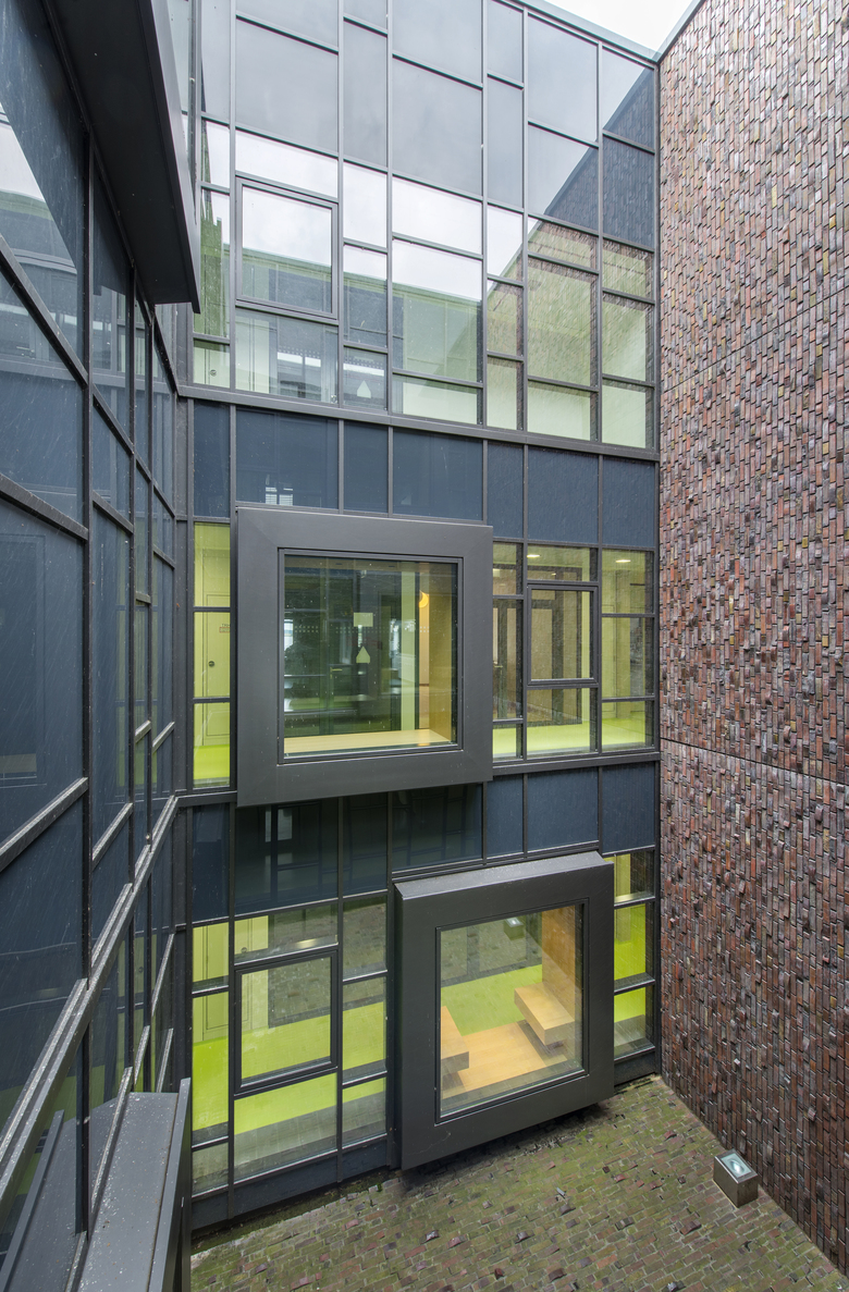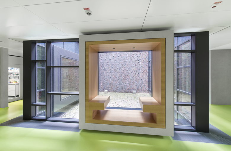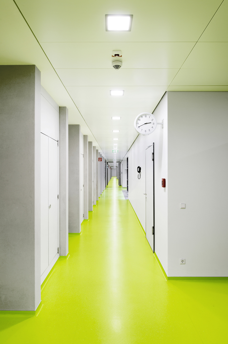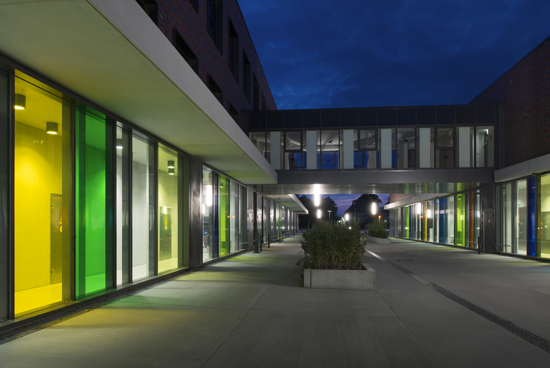 Fassade – Eine hinterlüftete Vormauerschale in Klinker prägt die äußere Erscheinung der großen Neubauten von Labor- und Tierhaltungsgebäude. Dieser in der Region traditionell stark verbreitete Baustoff ist sowohl kulturell und handwerklich als auch visuell vertraut. Er besitzt die Fähigkeit, über einen ausgesprochen langen Zeitraum und über alle Jahreszeiten hinweg eine emotional positive und zugängliche Atmosphäre zu schaffen. Witterungseinflüsse und das stetig wechselnde Licht auf Riems beeinflussen seine optische Erscheinung. Es entsteht ein Dialog mit dem Kontext, mit der Natur wie auch mit den bestehenden Klinkerbauten. Dies generiert eine starke Verwandtschaft der Architektur mit der Institutslandschaft und der natürlichen Verortung auf der Insel. Zudem ist das Material enorm widerstandsfähig und insofern auch eine schlüssige Antwort auf die exponierte Lage an der See. Das Thema von Weite und Dichtheit des Masterplanes wird mit dem Klinker bis an das kleinste Bauelement - dem einzelnen Stein - weiter getragen. Aus der Distanz wirkt die Fassade ruhig, klar und homogen. Die einzelnen Steine werden nicht bewusst wahrgenommen, die Flächen verfügen jedoch über eine lebendige und tiefenwirksame Ausstrahlung. Nähert sich der Betrachter dem Gebäude, werden die einzelnen Steine Schritt für Schritt besser sichtbar. Dies schafft Vertrautheit und verleiht den großen Gebäuden über diesen kleinsten Baustein eine menschliche Maßstäblichkeit. Die verglasten Fassaden im Erdgeschossbereich der „Inneren Straße“ reagieren komplementär auf die Lochfassaden auf der Außenseite der Gebäude. Sie begegnen der räumlich dichten Situation mit Offenheit und Transparenz. Die Wand existiert als Thema nicht, das Glas wird - von der ausschließlich technischen Funktion befreit - zum gestalterischem Element. Dabei spielt der hohe Grad an Transparenz auch eine große Rolle im Sicherheits- und Kommunikationskonzept. Analog zum Phänomen der maßstäblichen Wirkung des Klinkers wird mittels der Einteilung und Proportionierung der Gläser der enormen Länge der Gebäude von 230 m ein menschlicher Maßstab entgegengesetzt. So sind die bewusst gewählten Formate der Gläser Abbild eines Proportionierungssystems analog der Fibonacci-Reihe, welches sich über die ganze Länge der Fassade entwickelt. Die Farbgebung der Glasscheiben leitet sich aus der Analyse der Farbpalette des Kontextes ab. Die Sichtbetonoberfläche der „Inneren Straße“ dient dabei als Leinwand und Projektionsfläche für die farbigen Schatten der Gläser und wird zum räumlich erlebbaren Ort für die sich täglich verändernde Einwirkungen von Licht und Wetter.